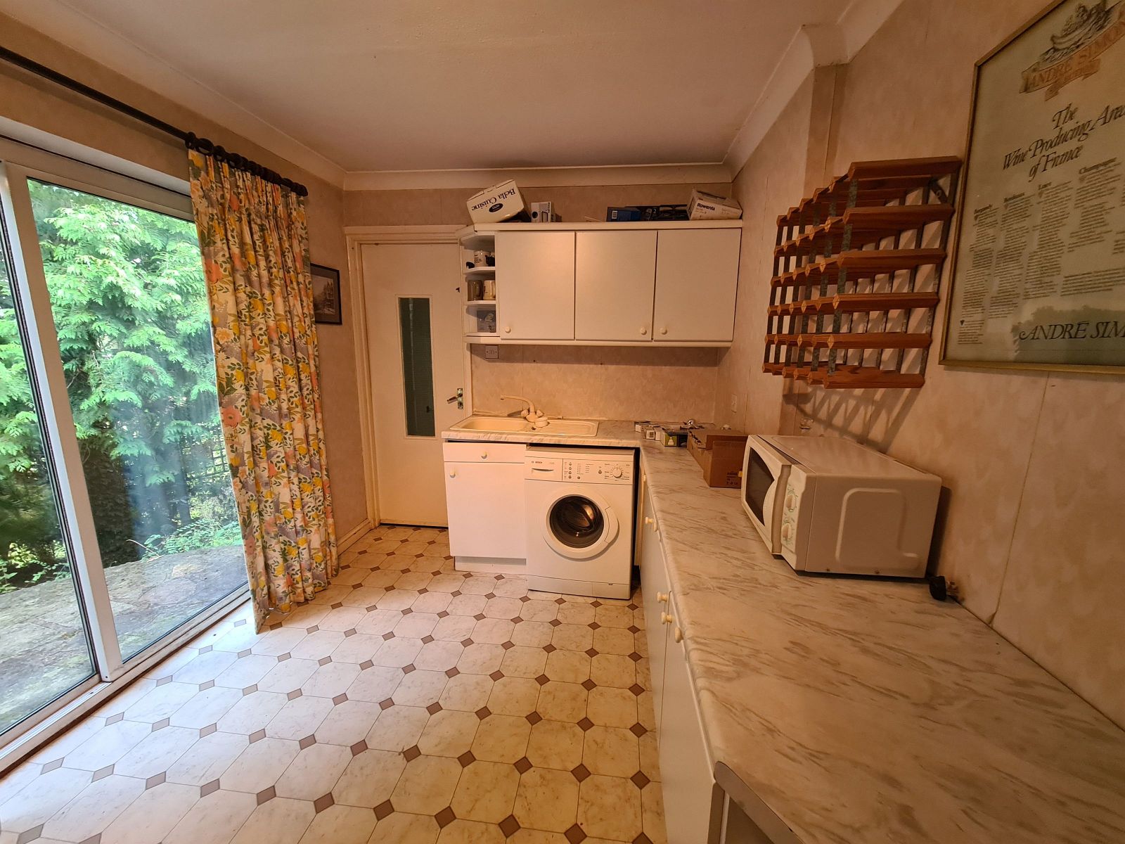 with single drainer sink unit with mixer tap inset in laminated work surface, cupboard under, adjoining space and plumbing for automatic washing machine, matching range of fitted floor and wall cupboards with end shelving, single radiator, deep built-in storage cupboard with light, coving, vinyl flooring, sliding double glazed doors to sun terrace and garden. Part glazed door to rear lobby providing access to the annexe and garage.