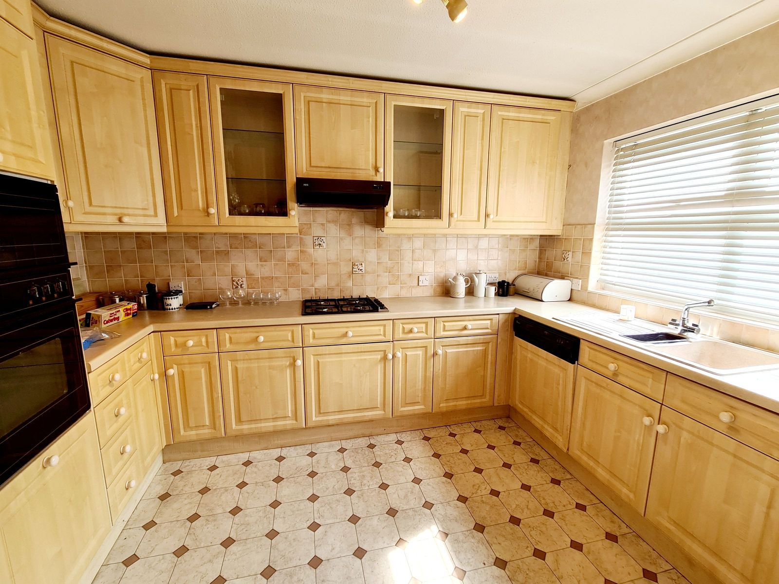 Comprising 1½ bowl single drainer Asterite sink unit with mixer tap inset in laminated work surface with cupboard under, adjoining dishwasher with matching fascia, matching range of fitted floor and wall cupboards with concealed lighting, two glass display cabinets, end shelving, AEG 4-ring gas hob unit with AEG cooker hood over, AEG electric oven and grill housed in tall matching unit with deep pan drawer cupboard under, overhead matching storage cupboard, tall fridge/freezer, cupboard above, floor standing gas fired boiler for central heating and domestic hot water housed in matching cupboard, part tiled walls, vinyl flooring, fitted shelf and telephone point. Opening to:-