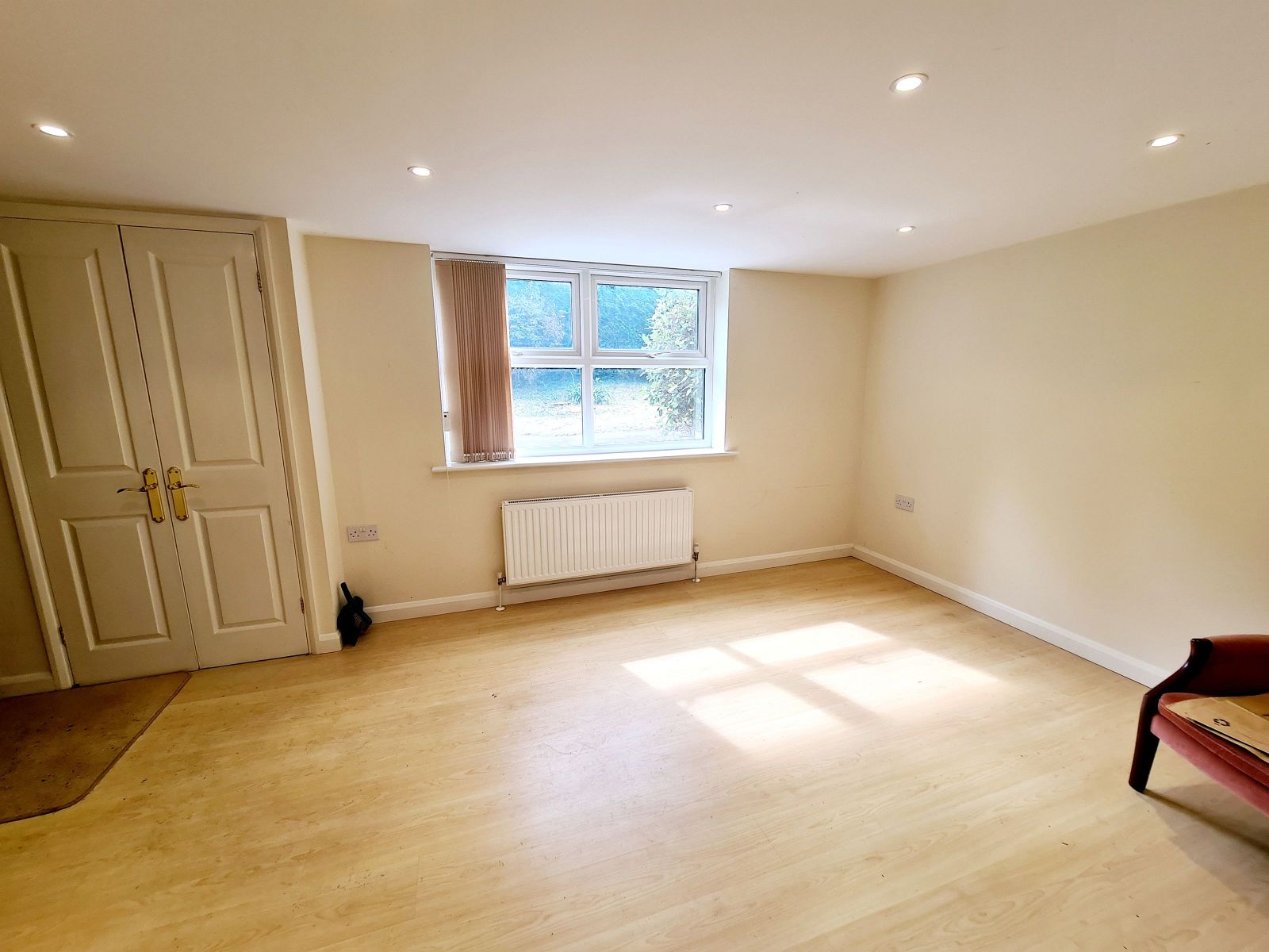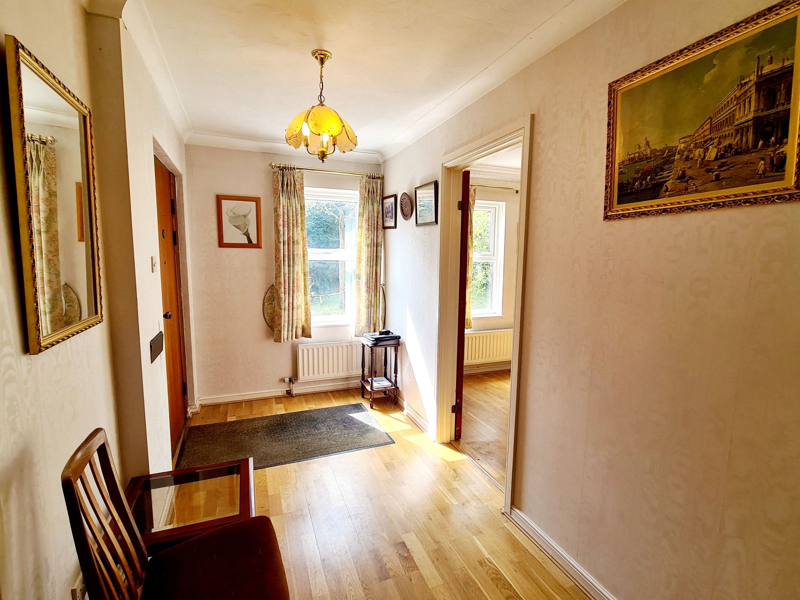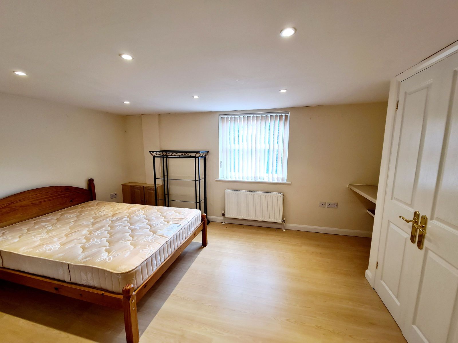 with double radiator, downlighting, meter cupboard with gas meter and wall mounted burglar alarm, t.v. point. Opening to: