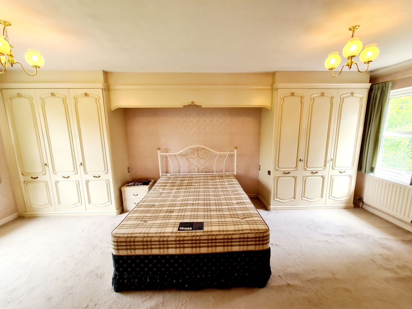 a double aspect through room with two single radiators, t.v. and telephone points, range of matching hanging and shelved wardrobe cupboards with central space for large double bed, matching free standing bedside drawer units. Archway to:-