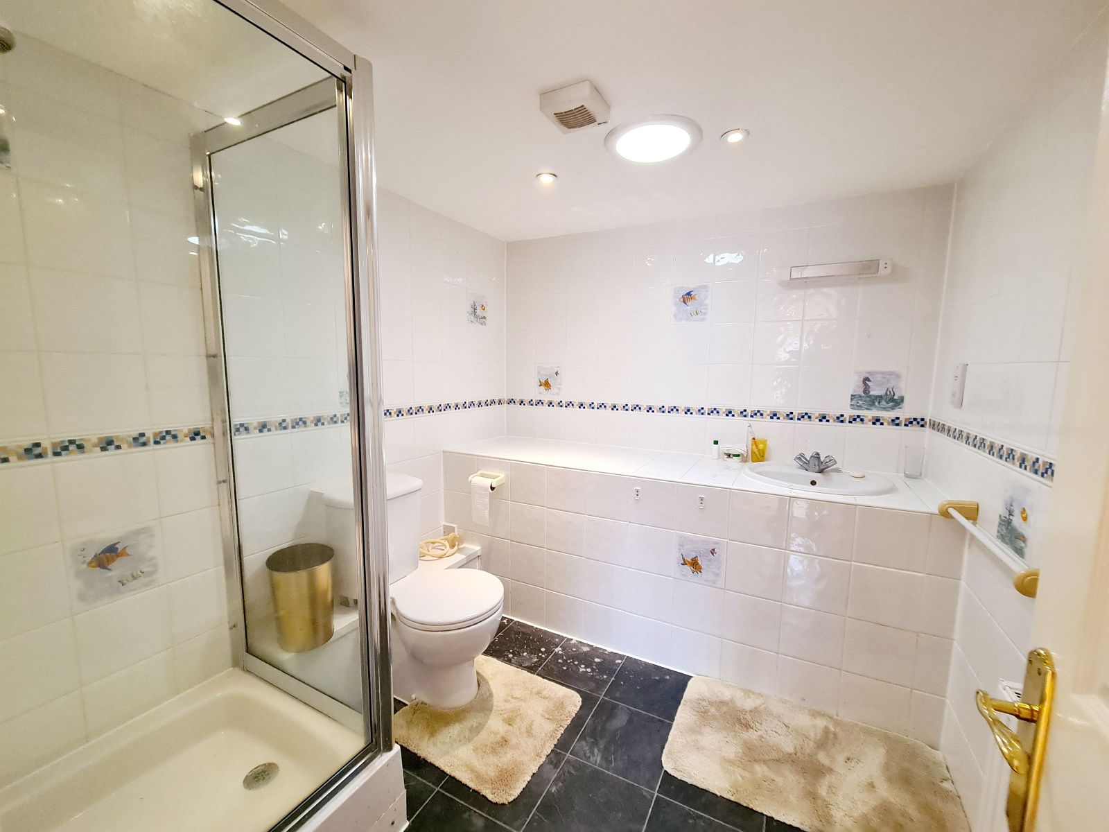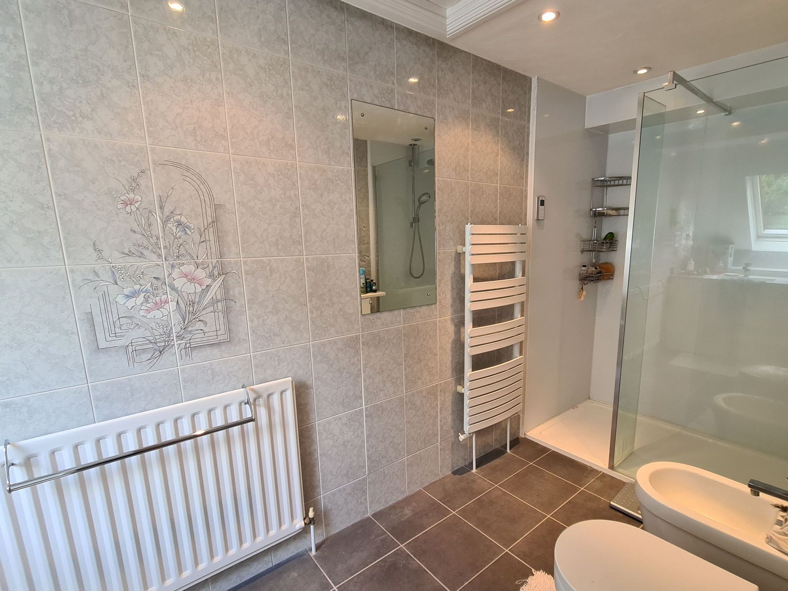 white suite comprising walk in shower with thermostatic shower unit, fixed rainfall shower and hand held shower, glazed shower screen, twin wash hand basins inset in wide vanity unit with cupboards under, shaver point to side, tiled shelf to rear, low level w.c., bidet, single radiator, fitted mirror, towel rail, access to loft, wall mounted Dimplex electric heater, fully tiled walls, double glazed skylight window, access to loft, ceramic tiled floor.