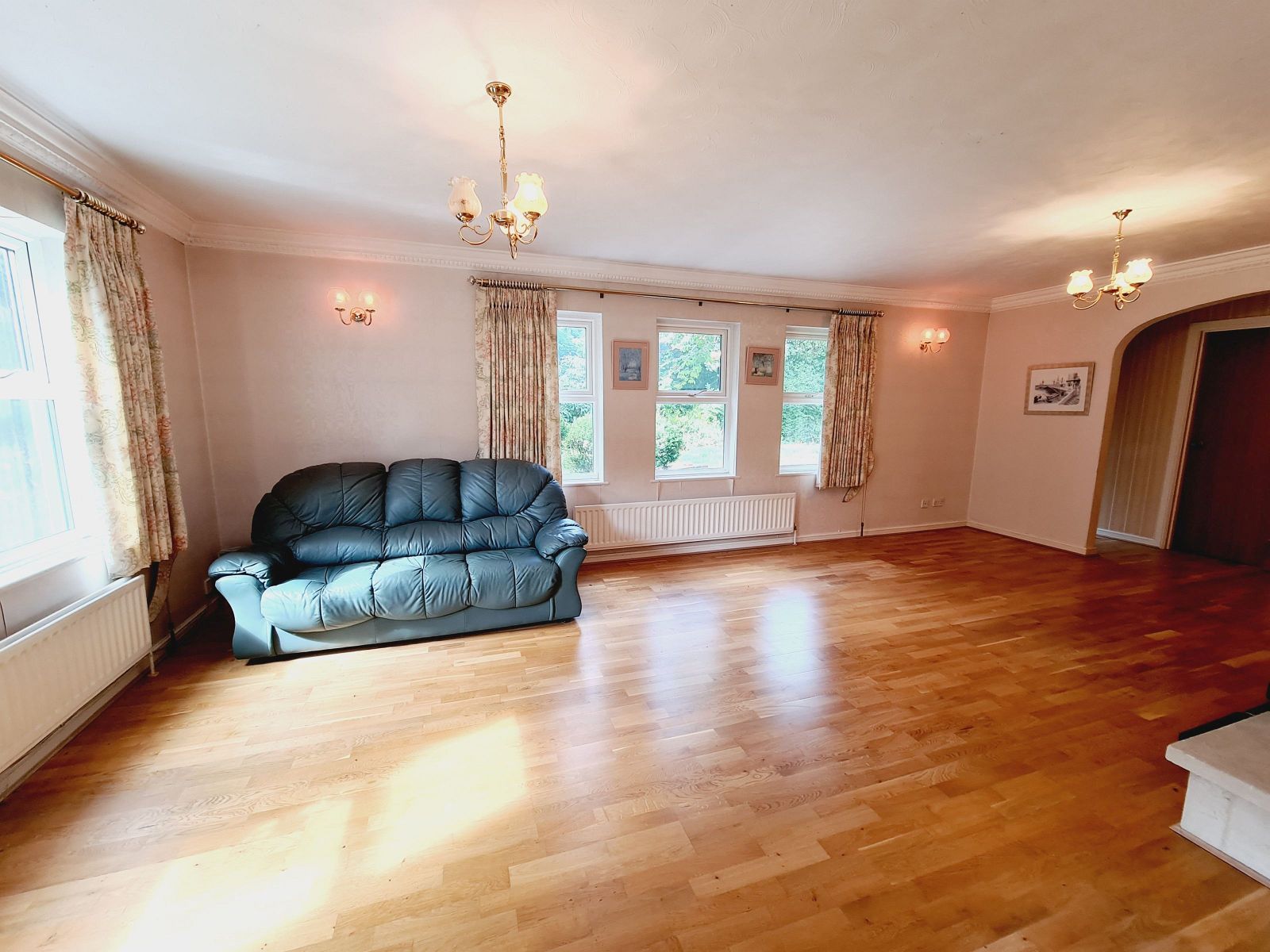 an attractively presented double aspect room with raised feature open fireplace, heavy wood mantle over, raised stone hearth, two t.v. points, telephone points, double and single radiators, two wall lights, cornicing, timber floor, wide archway to:-