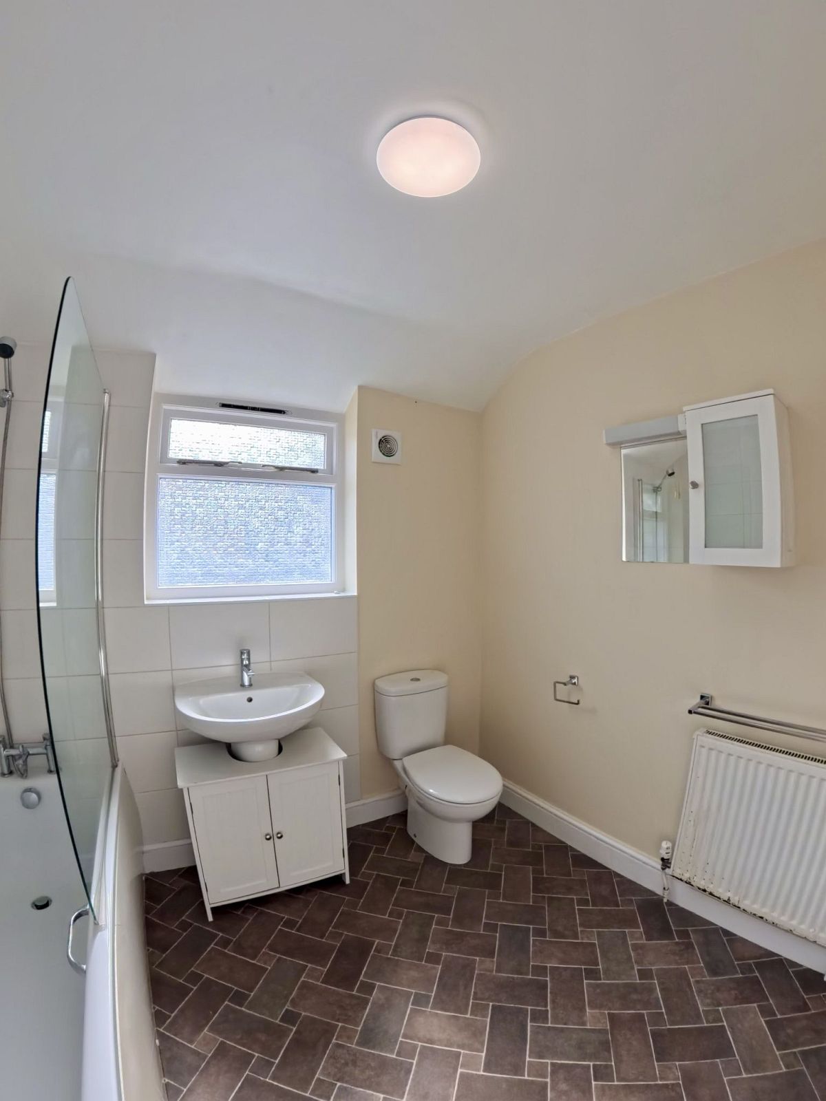 Window to side aspect, pedestal wash hand basin, low level wc, panel enclosed bath with mixer tap and shower attachment, glazed shower screen, small wall mounted vanity unit with mirror and light/shaver point above, extractor fan, radiator, towel rail, light point, lino flooring.