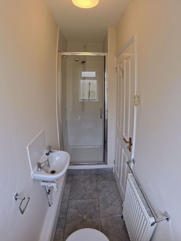 Window to rear aspect, low level wc, wash hand basin, glazed shower unit with power shower, tiled flooring, extractor fan.