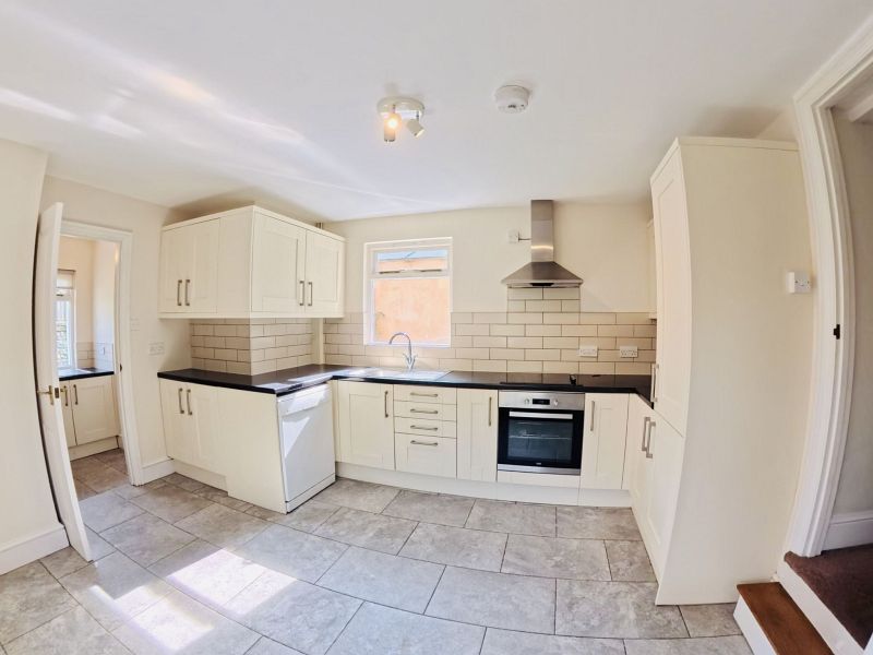 Double aspect room with a good range of eye and base level cupboard and drawers incorporating work surface, single sink/drainer unit with mixer tap, electric hob with electric oven under and chimney style extractor hood above, dishwasher, fridge/freezer, partly tiled walls, power points, tiled flooring, radiator, door to utility room.