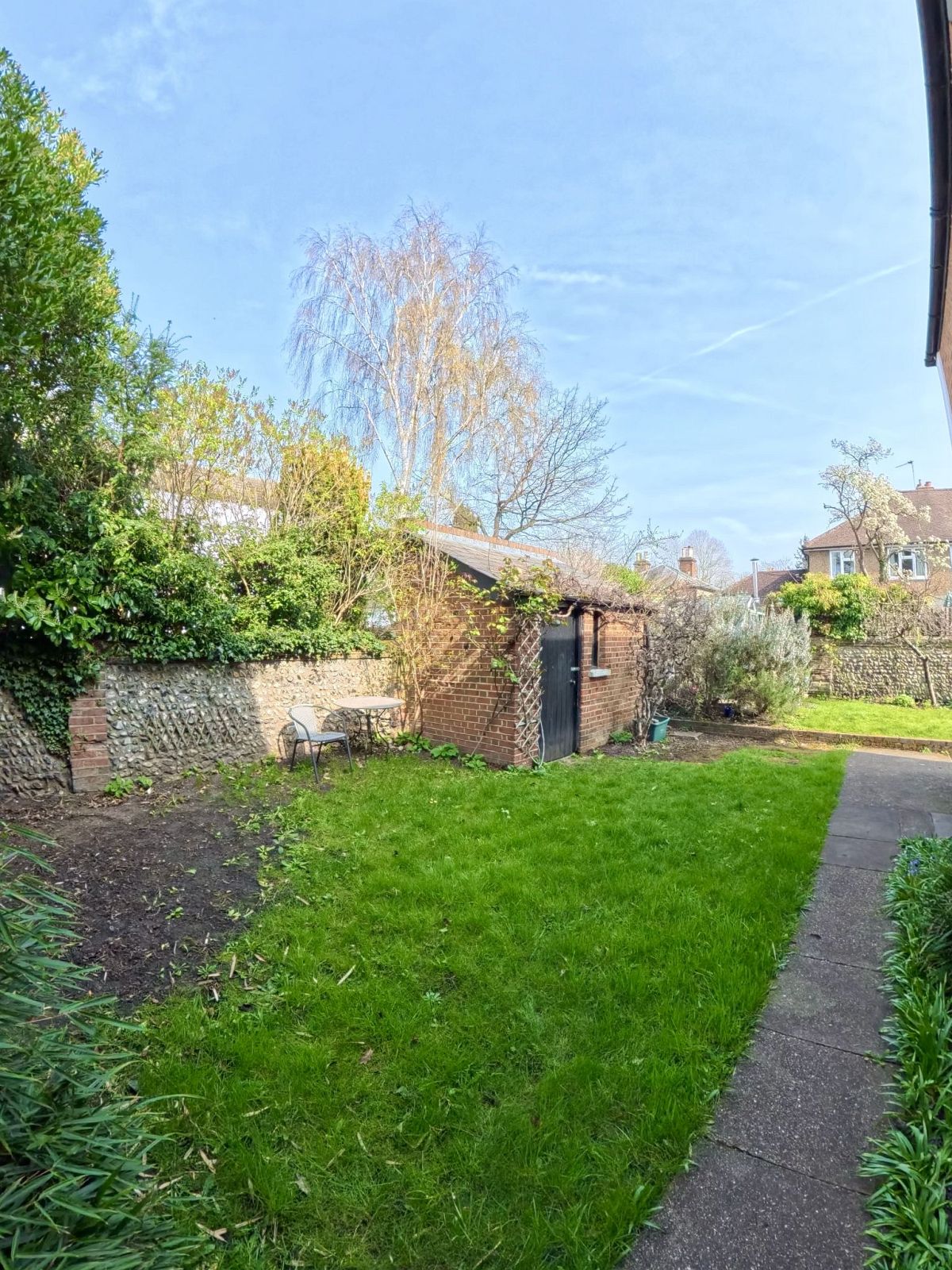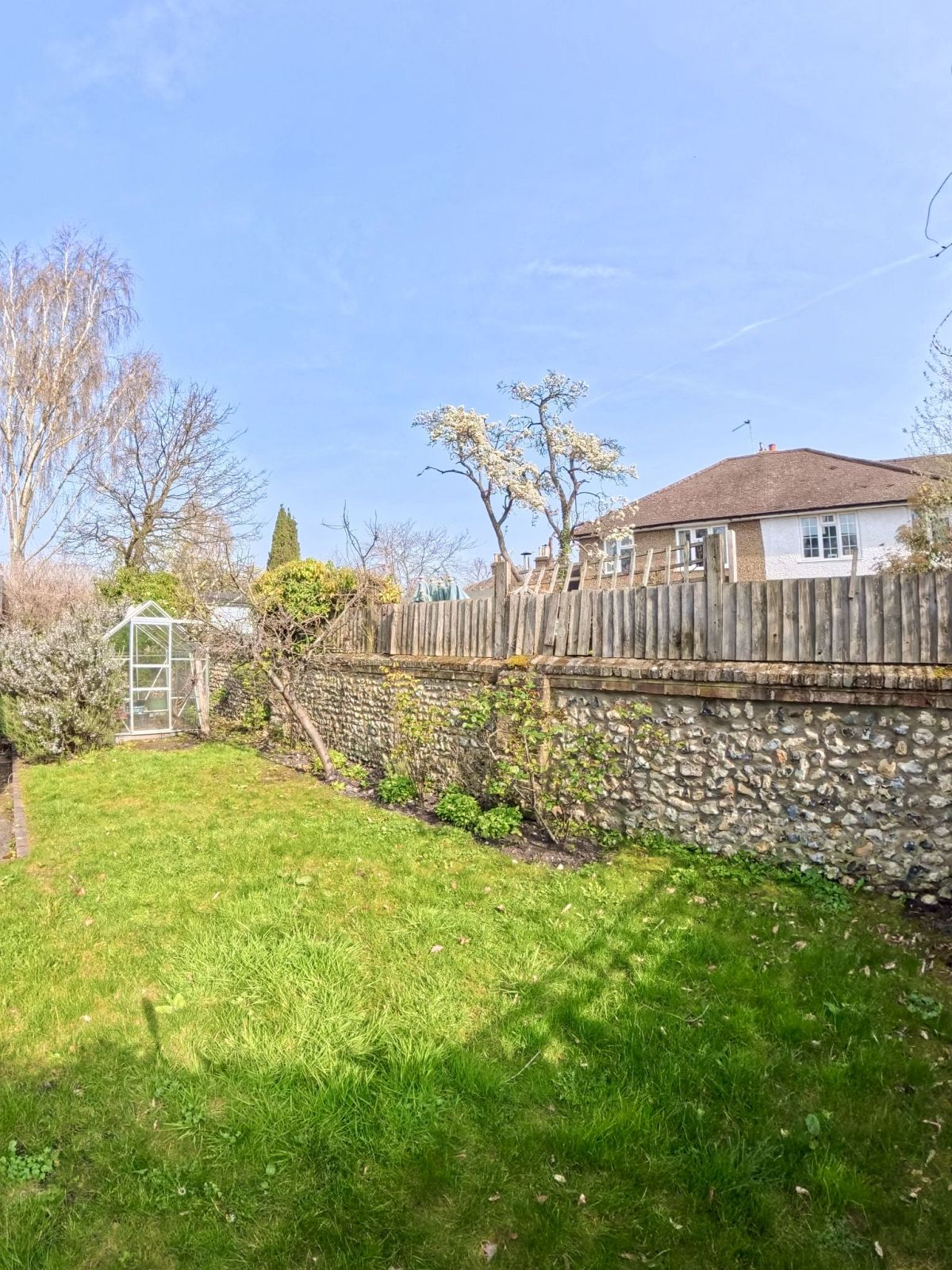 Pretty enclosed L shaped rear garden with mature plants and shrubs, small greenhouse.
