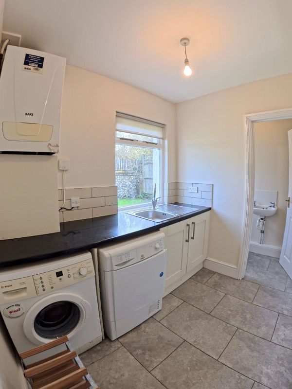 Sash window to rear aspect, worktop with single sink/drainer unit, washing machine, tumble drier, wall mounted combination boiler, part tiled walls, power points, tiled flooring, door to shower room.