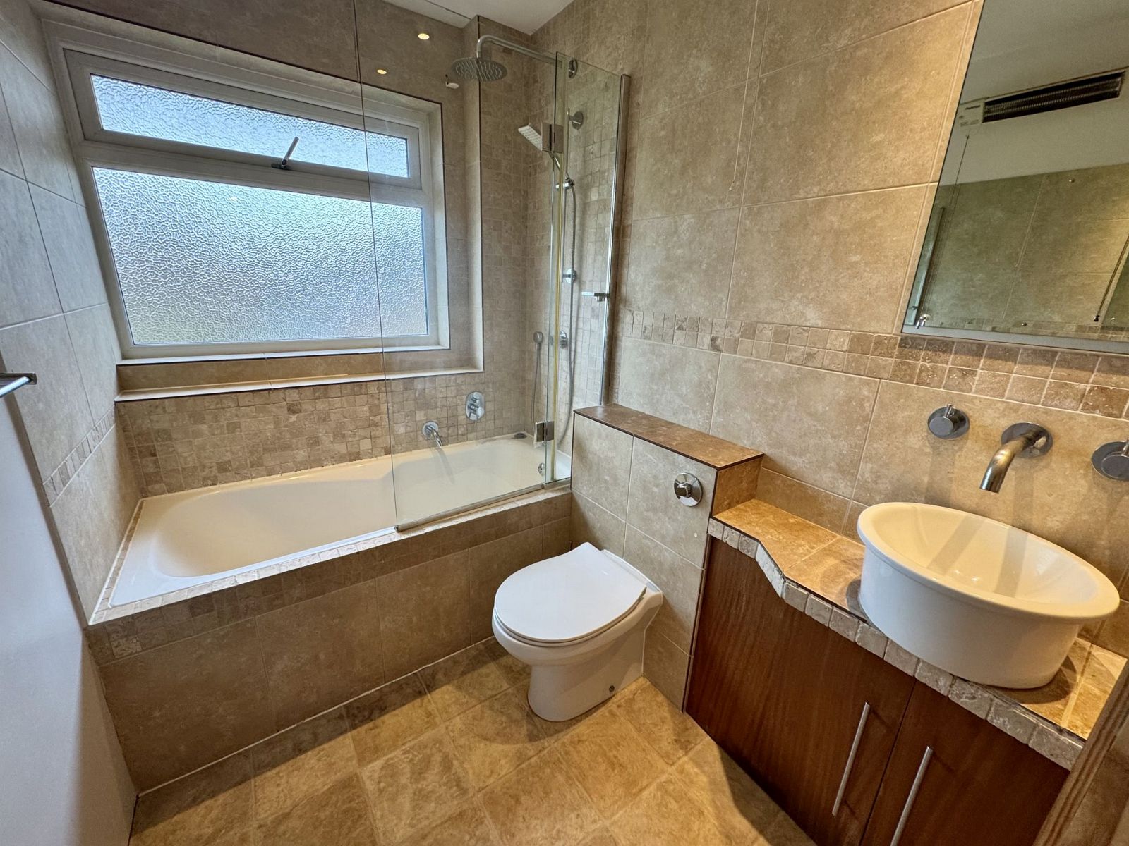 Tiled pedestal basin, shower, hand basin, WC concealed cistern, inset spotlights, tiled floor.
