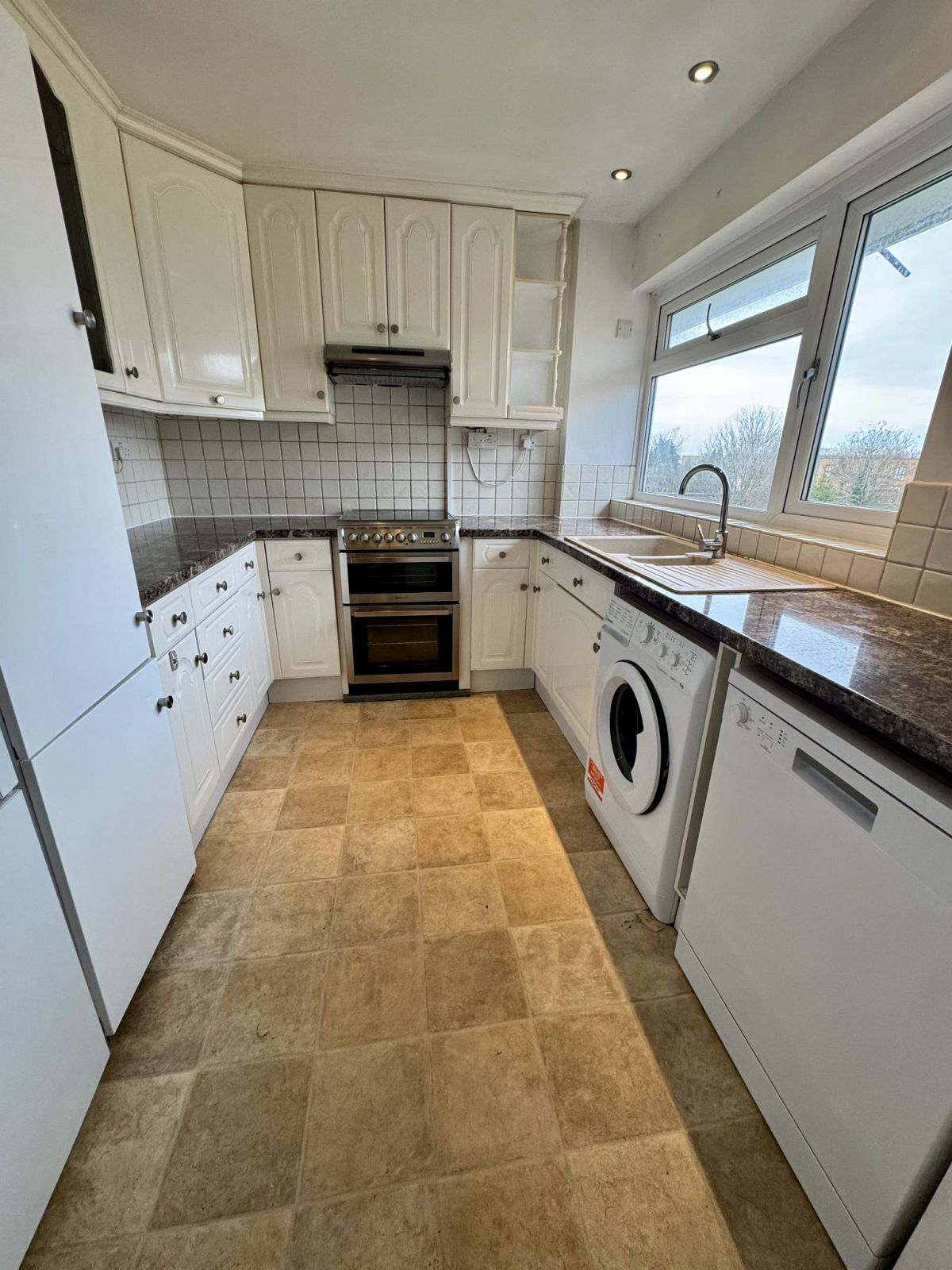 Singe drainer sink unit, slot-in double oven, washing machine, dishwasher, tall fridge/freezer, range of base and wall units, double glazed windows.
