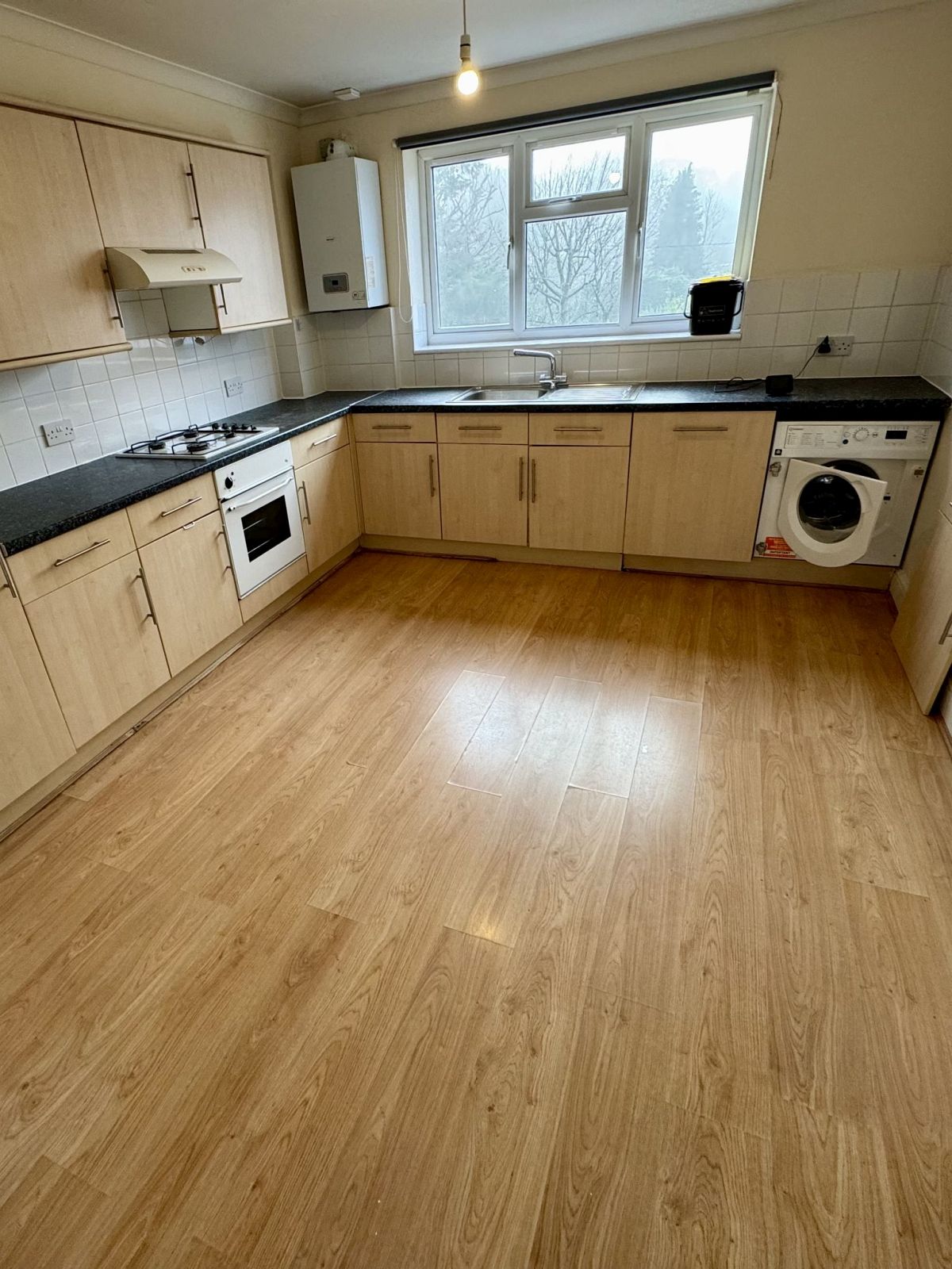 Range of fitted base and wall units, integrated washing machine, fridge/freezer, dishwasher.