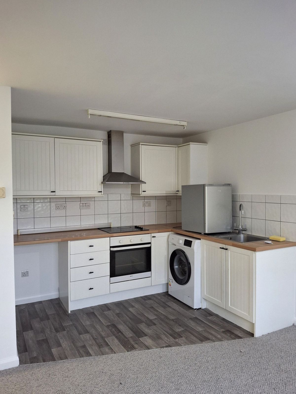 Range of fitted eye and base level cupboards and drawers incorporating single sink/drainer unit with mixer tap, built-in electric oven and hob with stainless steel chimney style extractor over, part tiled walls, power points, washer/dryer, low level fridge with freezer compartment.