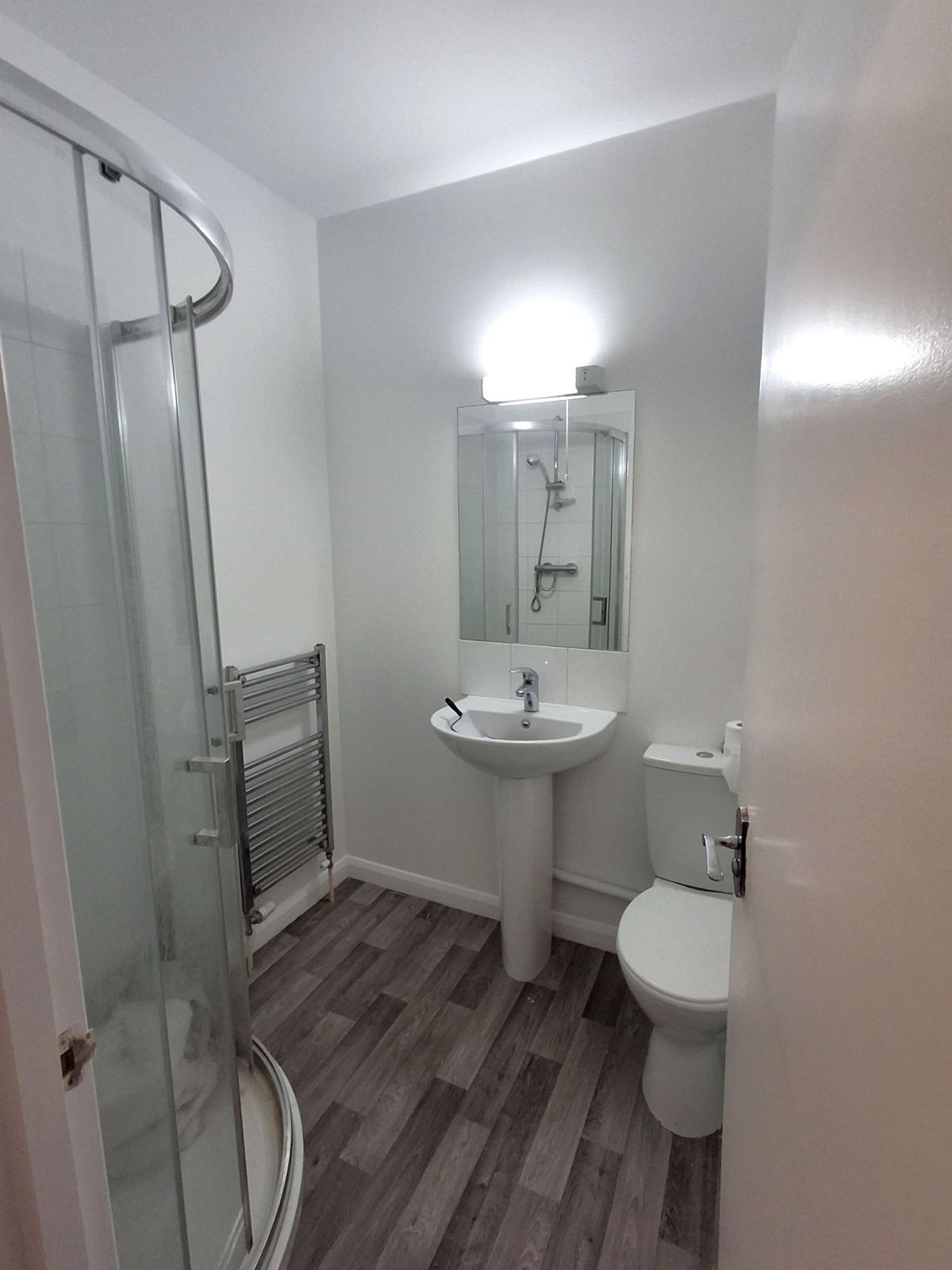 Glazed corner shower unit, low level w.c, pedestal wash basin with mirror and light/shaver point over, heated towel rail, extractor fan.