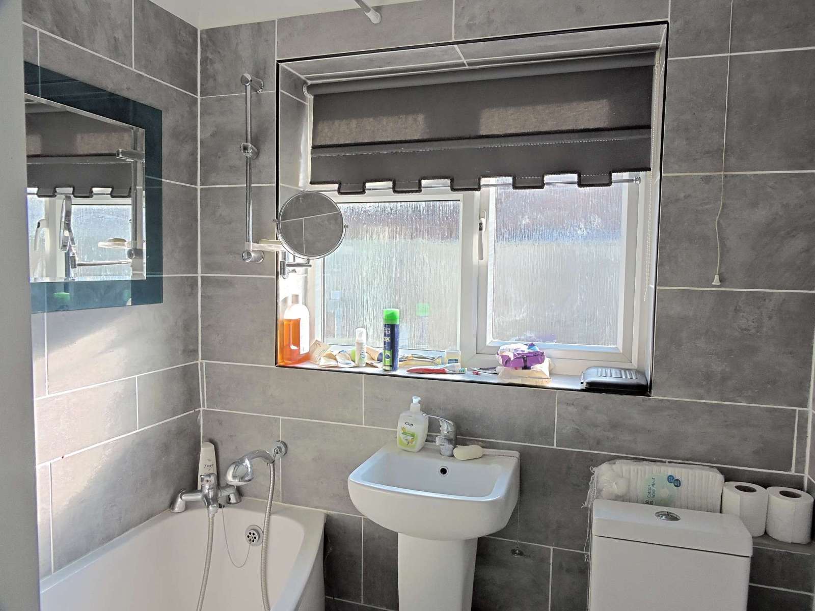 white suite comprising deep panel enclosed bath with mixer tap and shower attachment, shower rail & curtain, pedestal wash hand basin, mixer tap, low level w.c., fully tiled walls, extractor fan, recessed ceiling lights, chrome plated heated towel rail, obscure sealed unit double glazed window, coved ceiling, ceramic tiled floor.