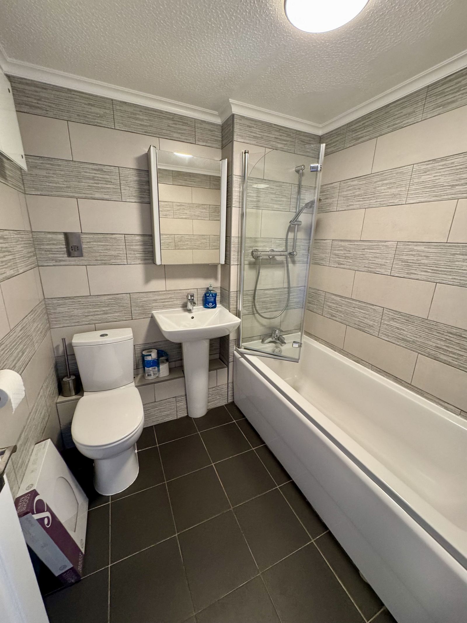 Modern fitted bathroom with white suite comprisong panelled bath, shower, glass shower screen, pedestal wash hand basin, low level WC, mirror fronted bathroom cabinet, fully tiled walls, towel rail, electric heater.