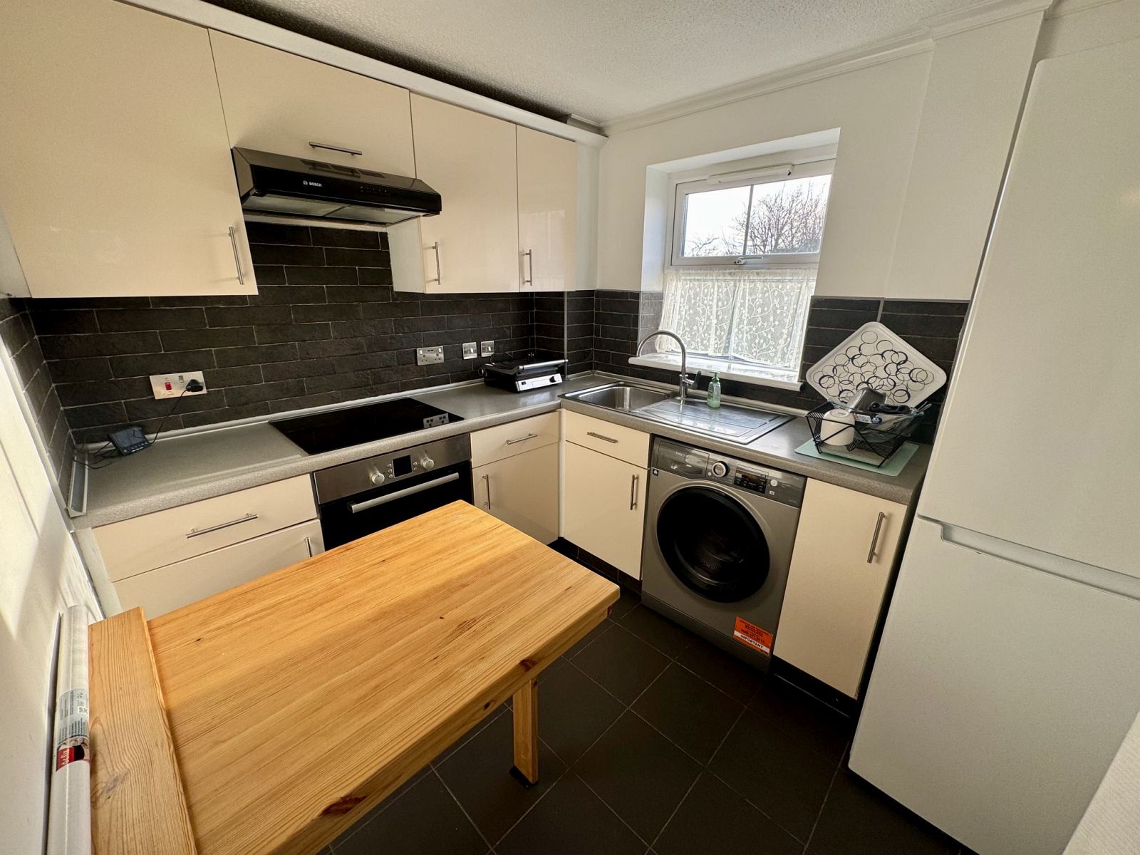 Fitted with base and wall units, laminate work surfaces, electric hob, oven with extractor over, fridge/freezer, washing machine, stainless steel single drainer sink unit, double glazed window, folding table, electric heater, part tiled walls, tiled floor.