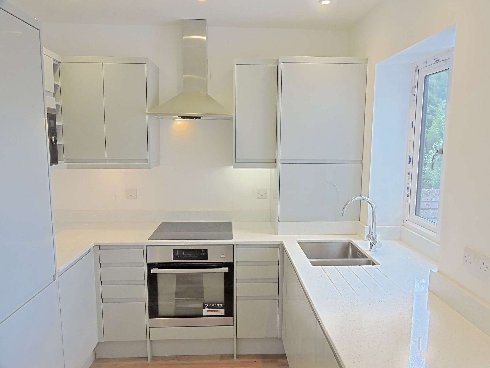 Fitted with a range of modern contemporary wall and floor units featuring a handleless design and complimented with quartz work surfaces and upstands,breakfast bar, underslung one and half bowl stainless steel sink unit with swan neck hot water tap, built in stainless steel electric oven and grill, AEG 4 ring ceramic hob, stainless steel extractor/ chimney hood, built in AEG eye level microwave, built in wine cooler, recessed ceiling lights, integrated fridge/freezer, integrated dishwasher, integrated washer/dryer, concealed Vaillant gas fired boiler, underfloor heating, USB sockets, sealed unit double glazed window, lightwood flooring, built in storage cupboard housing consumer unit.
