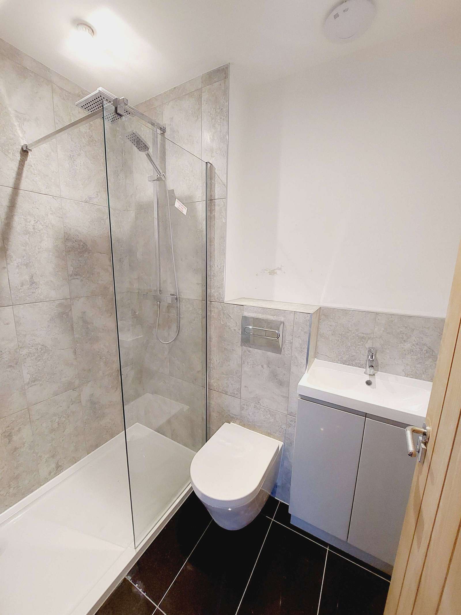 white suite comprising fully tiled wide shower cubicle with thermostatic shower unit, hand held shower plus fixed head rainfall shower, glazed fixed shower screen, low level w.c. with concealed cistern, vanity unit, wash hand basin, mixer tap, part tiled walls, extractor fan, heated towel rail, ceramic tiled floor, under floor heating, recessed ceiling lights.