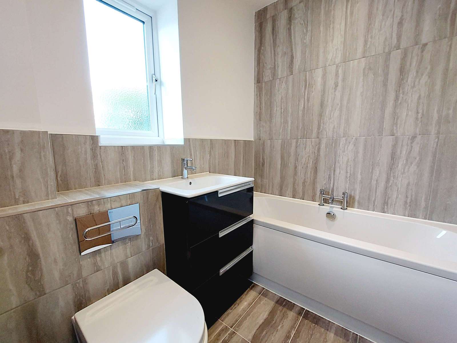 white 3 piece suite comprising panel enclosed bath with central mixer tap, low level w.c., vanity unit, wash hand basin with mixer tap, drawers under, shaver point, part tiled walls, extractor fan, heated towel rail, ceramic tiled floor, under floor heating, recessed ceiling lights, obscure sealed unit double glazed window.