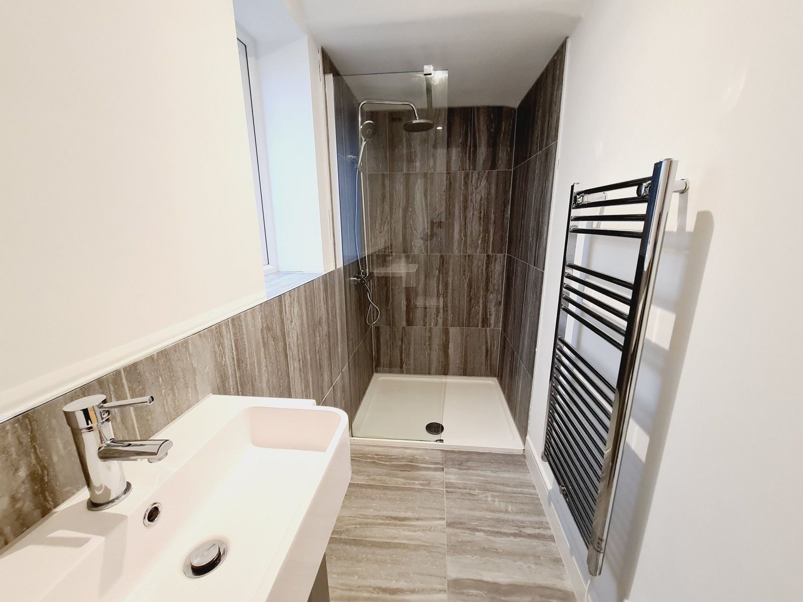 white suite comprising fully tiled wide low profile shower cubicle with thermostatic shower unit, hand held shower plus fixed head rainfall shower, glazed fixed shower screen, low level w.c. with concealed cistern, vanity unit, wash hand basin, mixer tap, extractor fan, heated towel rail, ceramic tiled floor, under floor heating, recessed ceiling lights, obscure sealed unit double glazed window.
