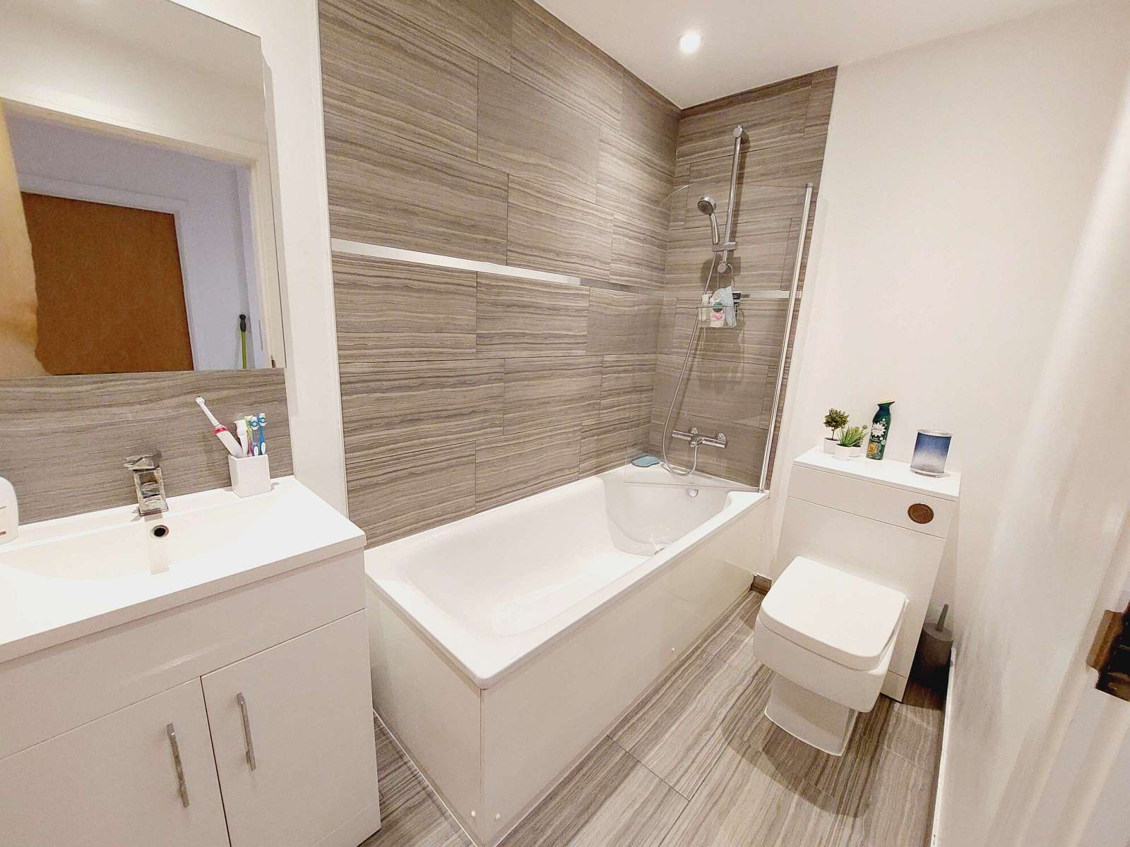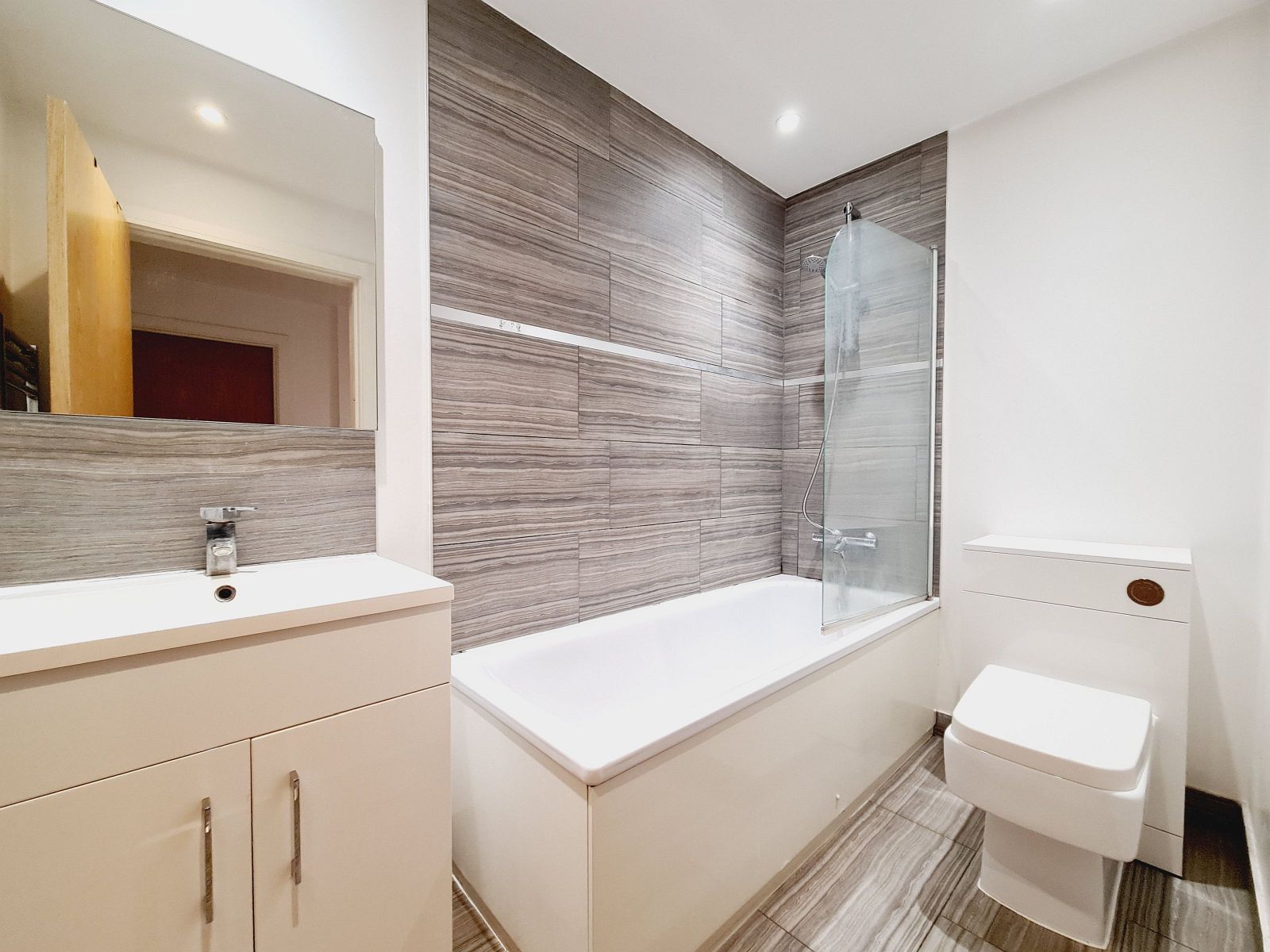 white suite comprising panel enclosed bath with mixer tap and shower attachment, glazed shower screen, vanity unit, wash hand basin, mixer tap, low level w.c., vinyl floor, part tiled walls, recessed ceiling lights, extractor fan, chrome heated towel rail.