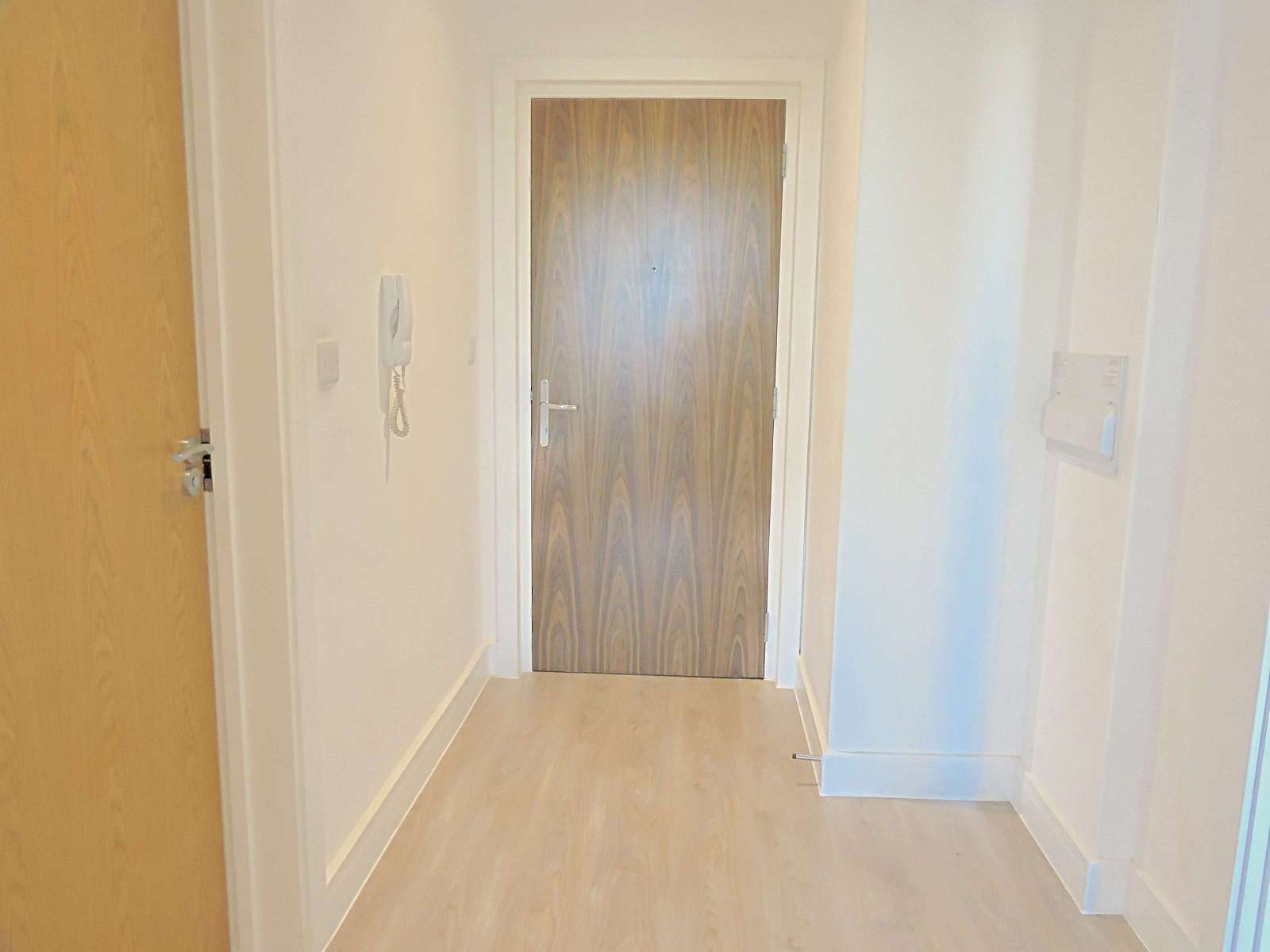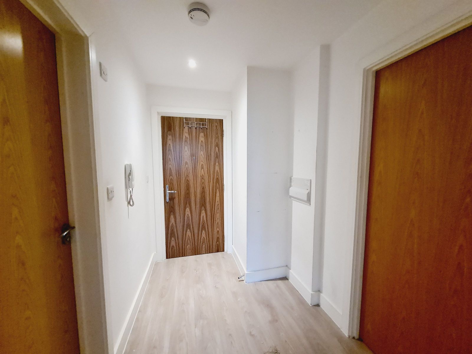 Front door, recessed ceiling lights, smoke detector, consumer unit, laminate floor, heating thermostat control, door to: