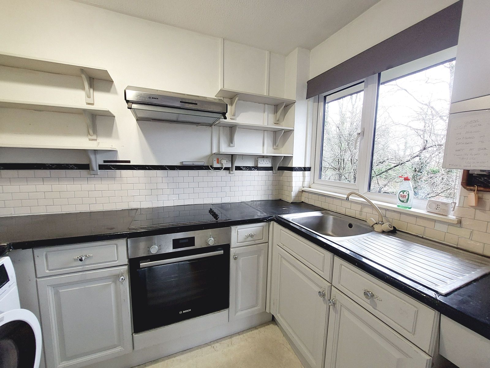 comprising single drainer stainless steel sink unit, mixer tap, range of grey fronted fitted floor units, contrasting work surfaces, display shelves, built in Bosch electric oven, inset ceramic hob, extractor fan above, Beko washing machine, Beko fridge/fridge, tile effect walls, vinyl floor, wall mounted Vaillant combination gas fired boiler for central heating and domestic hot water, sealed unit double glazed window.
