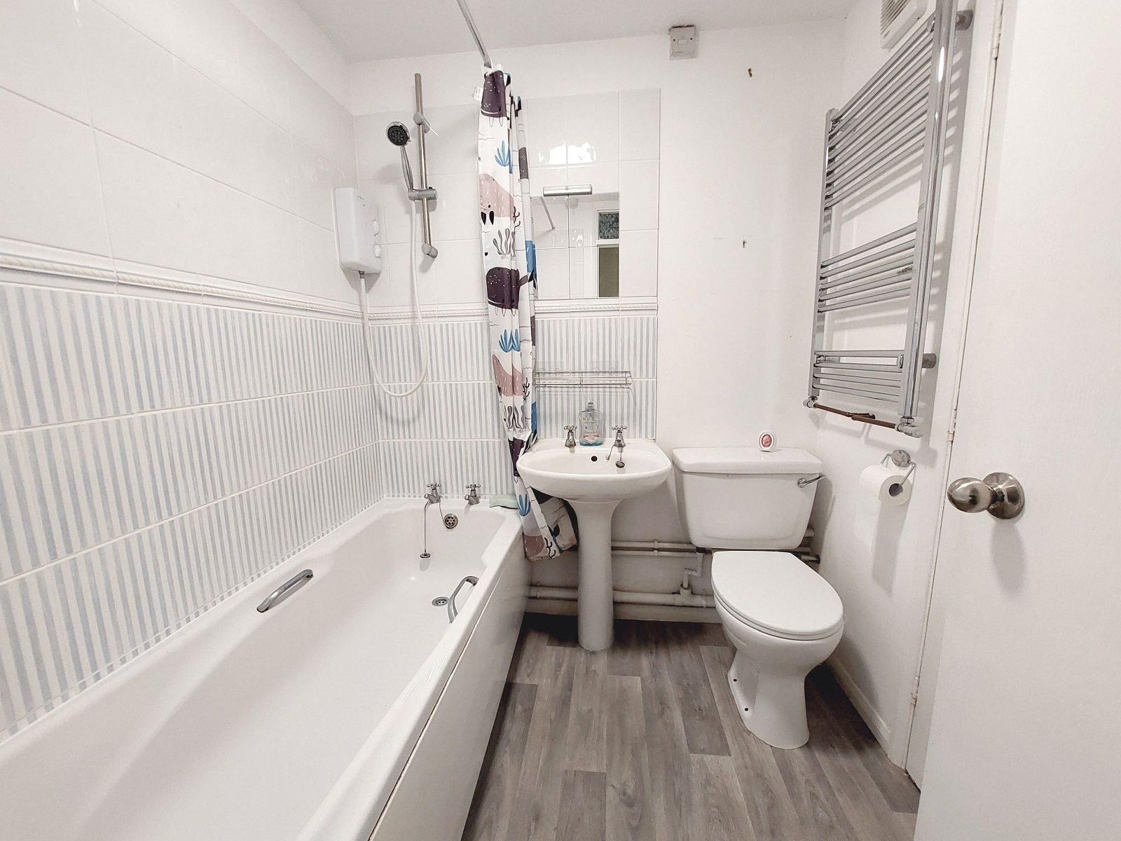 white suite comprising panel enclosed bath, wall mounted electric shower unit, shower rail and curtain, fully tiled surrounding walls, pedestal wash hand basin, low level w.c., vinyl floor, chrome heated towel rail, built in double storage cupboard.