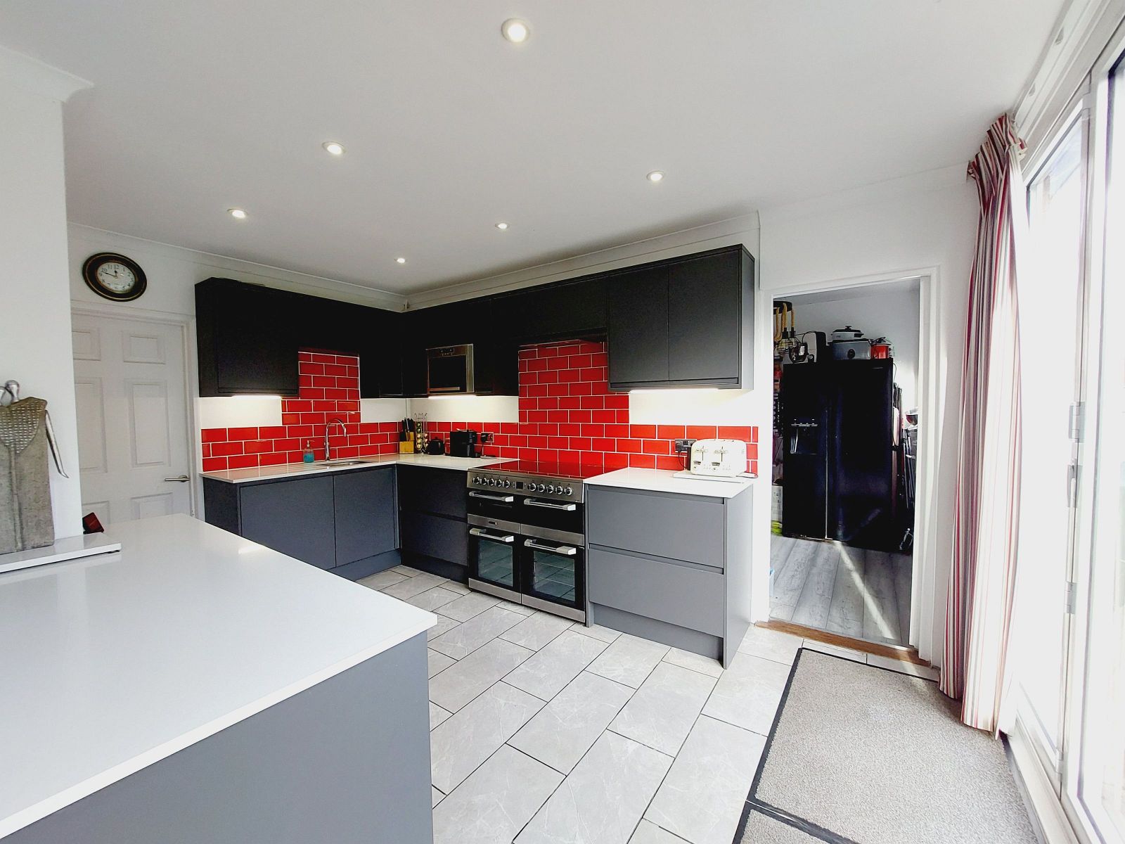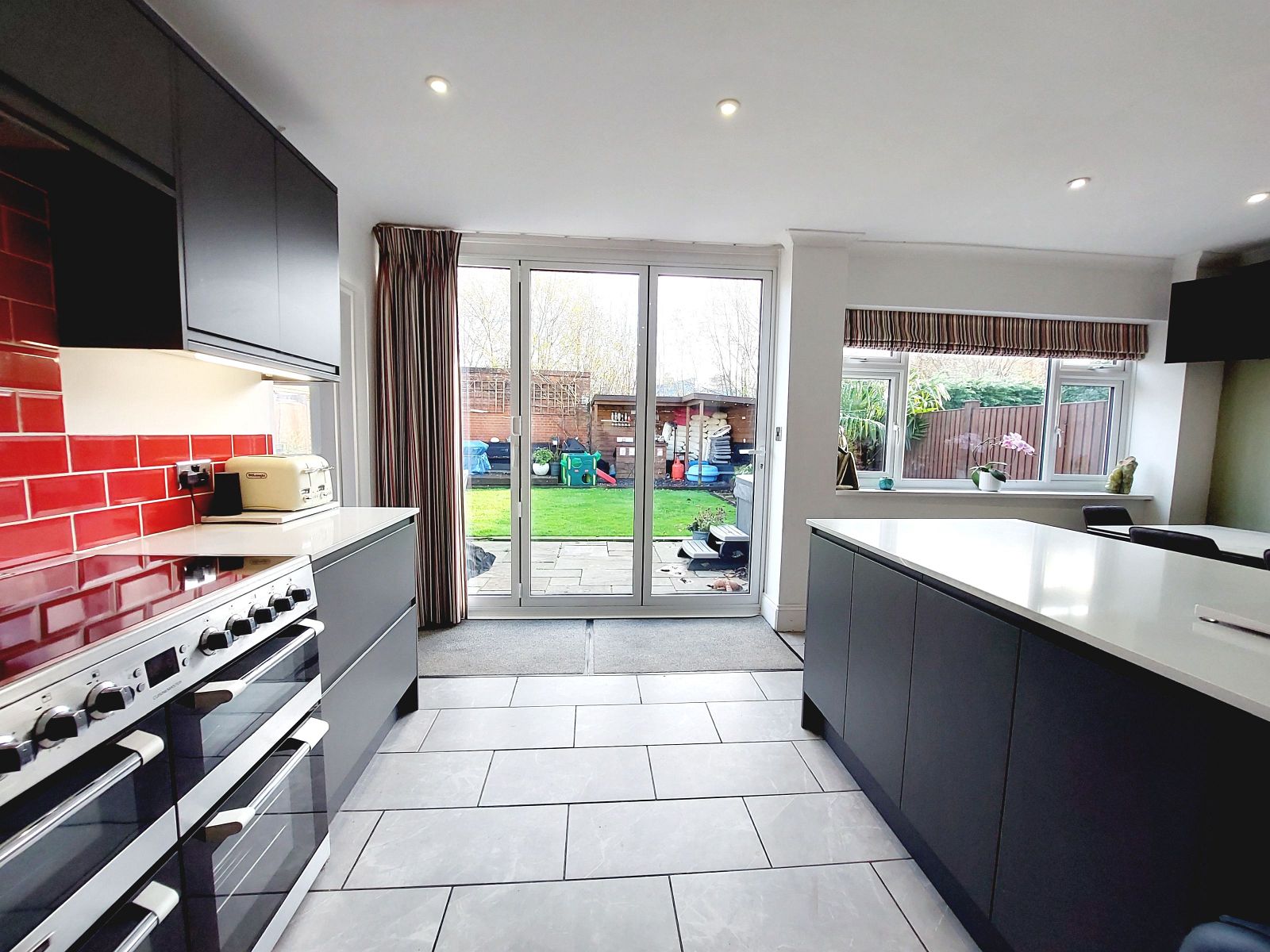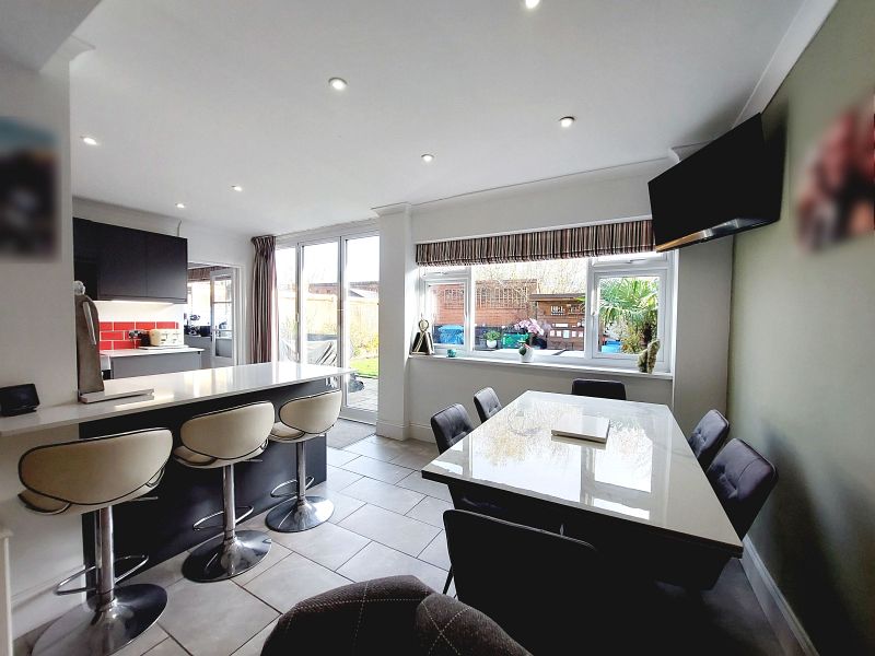 Overall. A superb L shaped room with the dining room leading into the family room and full height bi fold doors from the kitchen overlooking the garden. The kitchen/breakfast room is fitted with a range of contemporary fronted units and drawers including a substantial peninsula with breakfast bar featuring a handleless design and complemented with Quartz worktops. Feature Quooker filter and boiling water tap, under slung stainless sink, Cuisinemaster Leisure Rangemaster with 3 ovens and ceramic hob, extractor hood, eye level stainless steel microwave, integrated dishwasher, ceramic tiled floor, part tiled walls, concealed lighting, recessed ceiling lights, feature radiator. Dining area opening to family room, sealed unit double glazed window, fitted shelves, fitted cupboards, recessed ceiling lights, ceramic tiled floor, feature radiator, understairs cupboard, consumer unit.