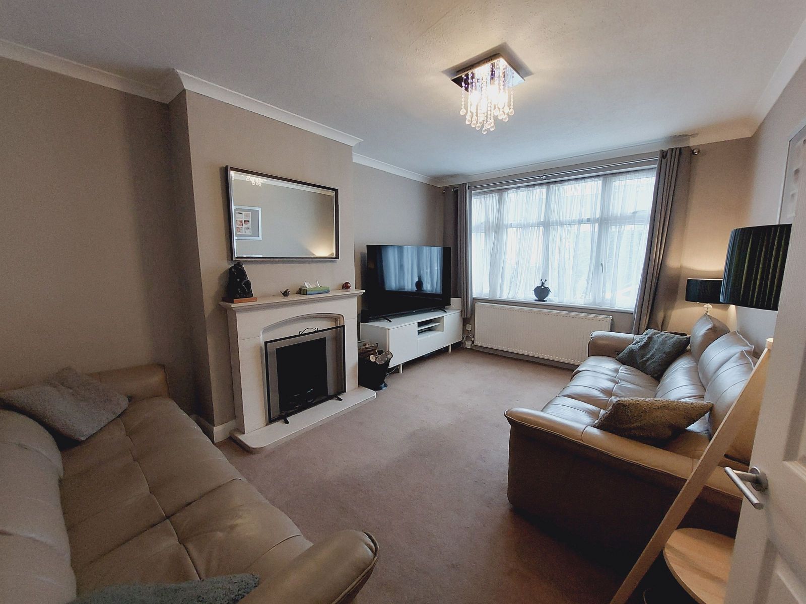 attractive Adam style central stone fireplace, stone mantel & hearth, radiator, sealed unit double glazed window.
