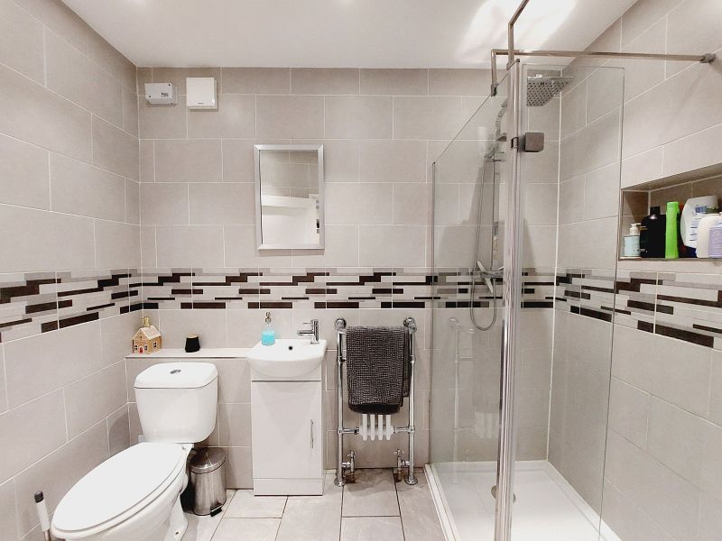 modern white suite comprising full width low profile shower tray, thermostatic shower, fixed head rainfall shower plus hand held shower, fixed glazed shower screen, tiled recess, low level w.c., vanity unit, inset wash hand basin, mixer tap, cupboard under, chrome towel rail, extractor fan, fully tiled walls, ceramic tiled walls, recessed ceiling lights.