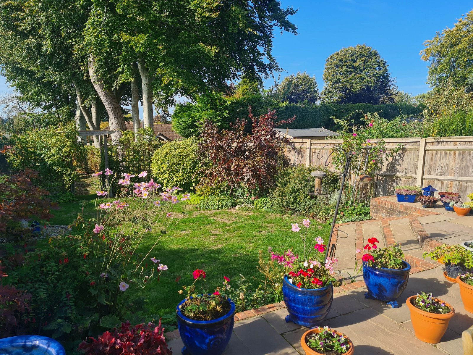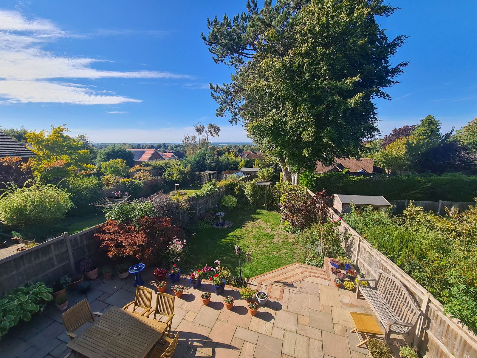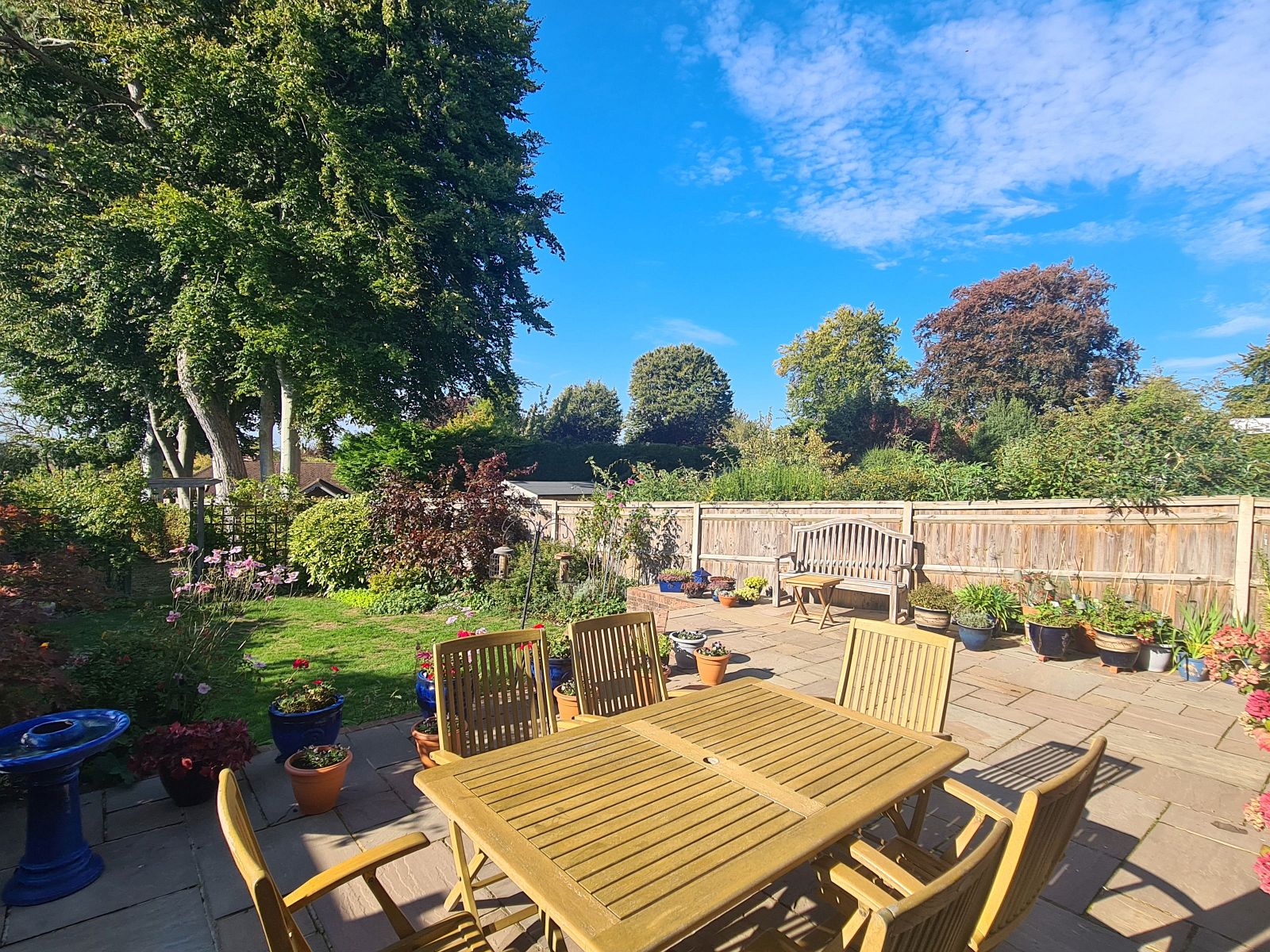 The rear garden is a superb feature, laid to lawn with a very generous full width paved patio, useful covered storage area located to the side behind the garage, outside cold water tap, security light with sensor. There are well stocked flower borders, mature trees, variety of shrubs, plants and evergreens and timber pergola leads through to a further garden area. The garden is enclosed by 1.8m high panel fencing with concrete posts and part Beech hedge.