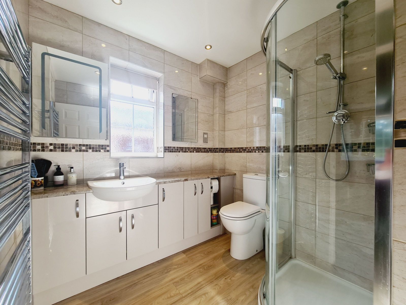 white suite comprising fully tiled low profile shower cubicle, Aqualisa thermostatic shower unit, curved glazed sliding screen, low level w.c., vanity unit, inset wash hand basin, cupboards under, fitted mirror, fitted mirror fronted medicine cabinet, shaver point, fully tiled walls, chrome heated towel rail, light wood effect floor, recessed ceiling lights, electric heated floor, obscure sealed unit double glazed window.