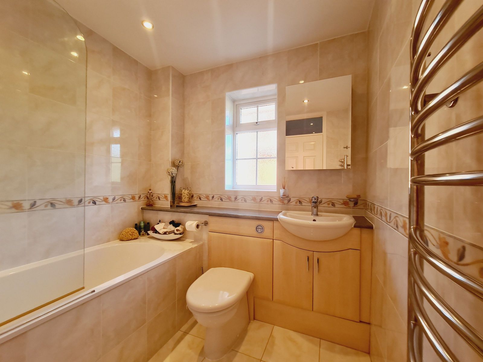white suite comprising tiled enclosed bath, mixer tap, Aqualisa thermostatic shower unit, curved glazed shower screen, low level w.c. with concealed cistern, vanity unit, inset wash hand basin, mixer tap, cupboards under, fitted mirror fronted medicine cabinet, display shelf, tiled floor, fully tiled walls, chrome heated towel rail, recessed ceiling lights, obscure sealed unit double glazed window.
