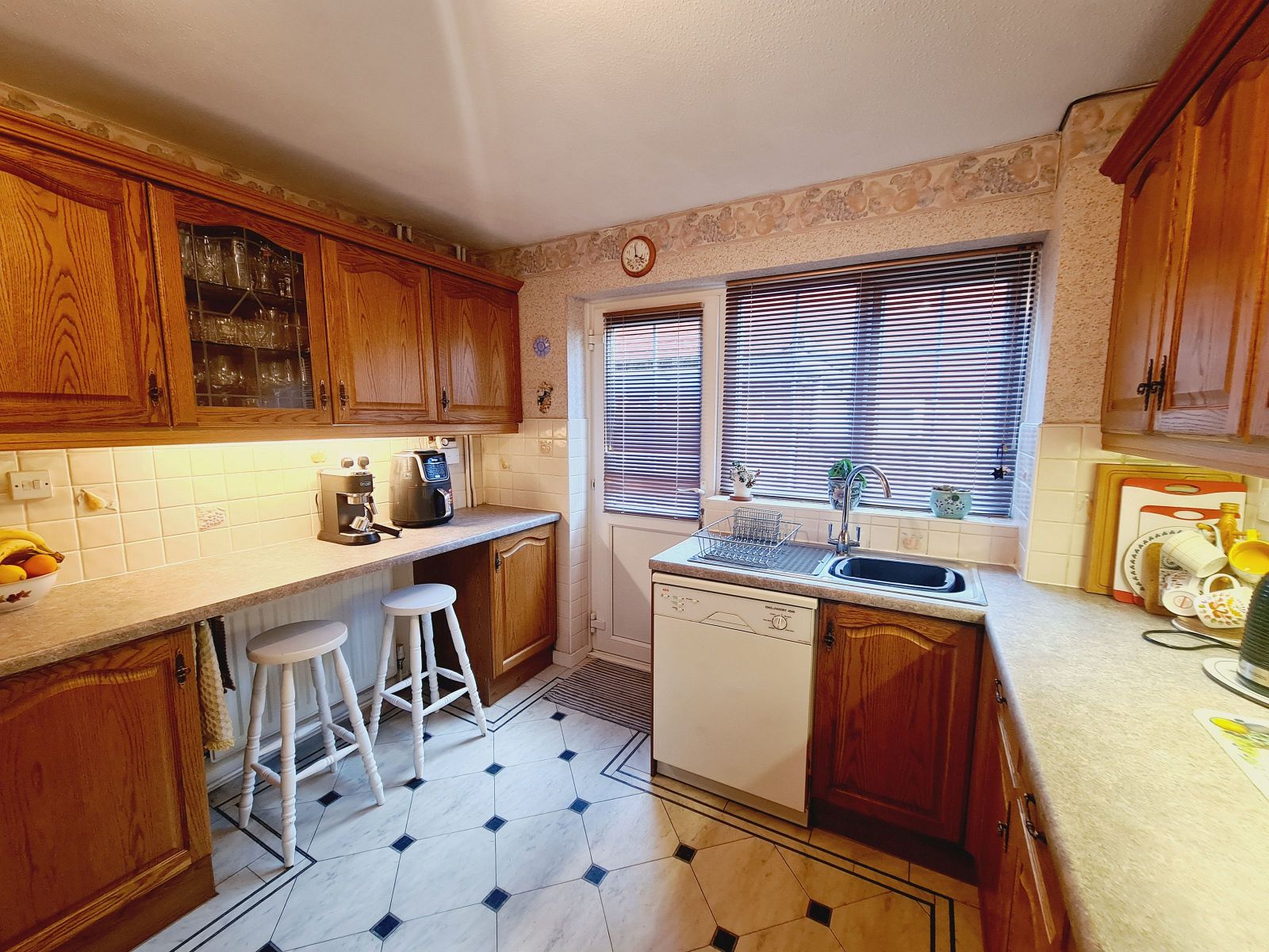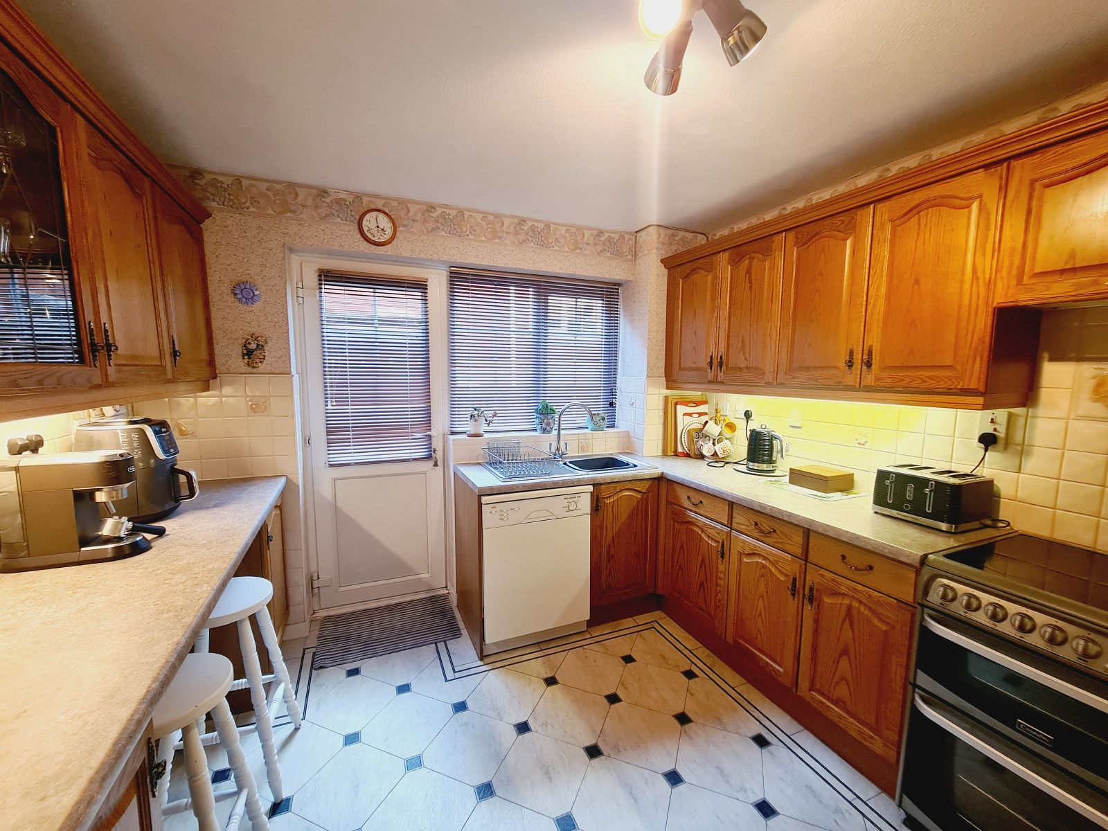comprising a range of wooden fronted wall and floor units, complimented by contrasting work surfaces, inset single drainer single bowl stainless steel sink unit, mixer tap, part tiled walls, under counter lights, Cannon fitted oven, AEG dishwasher, appliance space, breakfast bar, radiator, vinyl floor, sealed unit double glazed window and door.