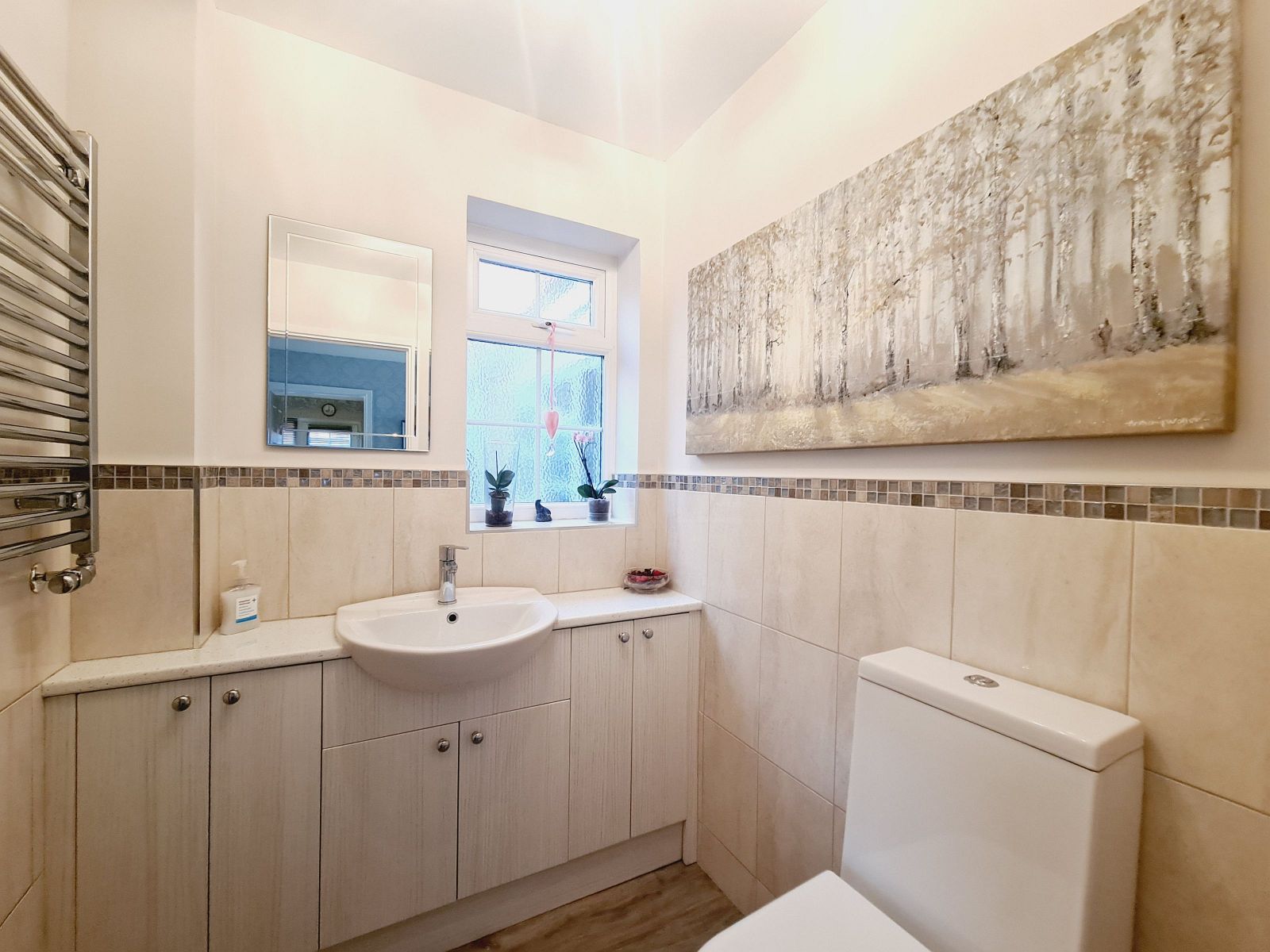 modern white suite comprising low level w.c., vanity unit with cupboards to side and under, wash hand basin, mixer tap, part tiled walls, chrome towel rail, obscure sealed unit double glazed window, vinyl floor.