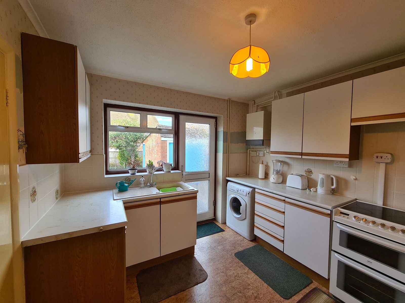 fitted with a range of cream fronted wall and floor units, matching work surfaces, part tiled walls, inset single bowl single drainer sink unit, mixer tap, electric cooker point and fitted cooker, washing machine, built in shelved storage cupboard, Potterton Suprima gas fired boiler for central heating and domestic hot water, radiator, double glazed window and door overlooking garden.