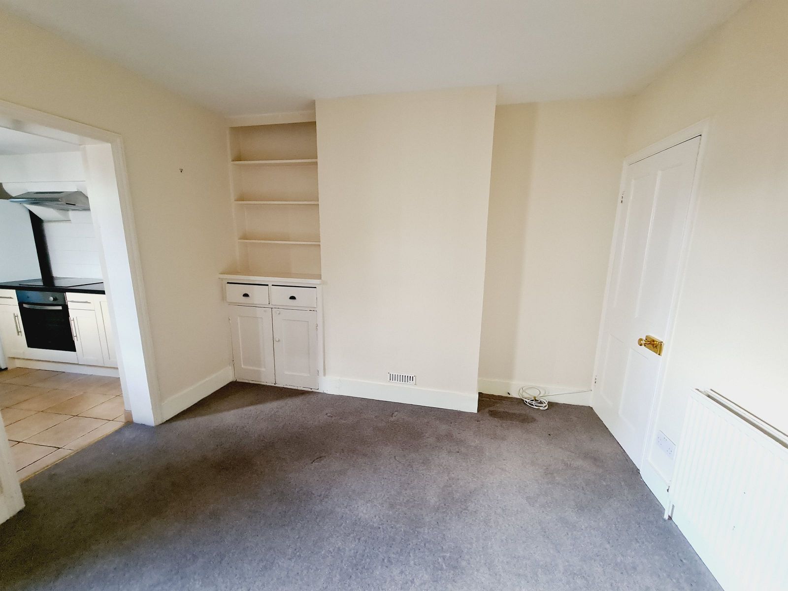 double radiator, built in double storage cupboard & drawers, display shelves above, under stairs storage cupboard with electric meter & consumer unit.