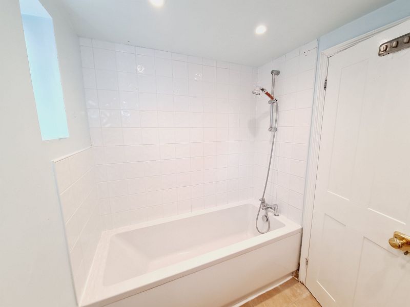 white suite comprising panelled enclosed bath, mixer tap and shower attachment, part tiled walls, wash hand basin, tiled splash back, fitted mirror, shaver point, radiator, low level W.C., ceramic tiled floor, recessed ceiling lights, extractor fan, two windows,