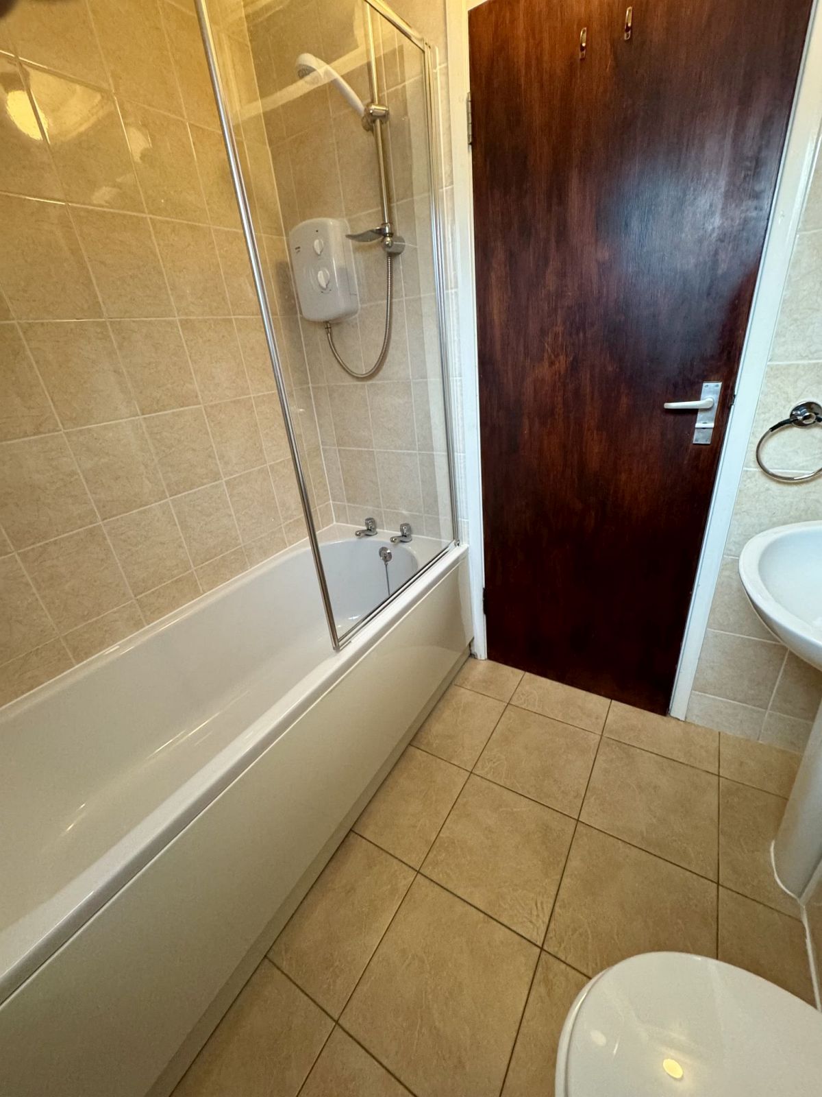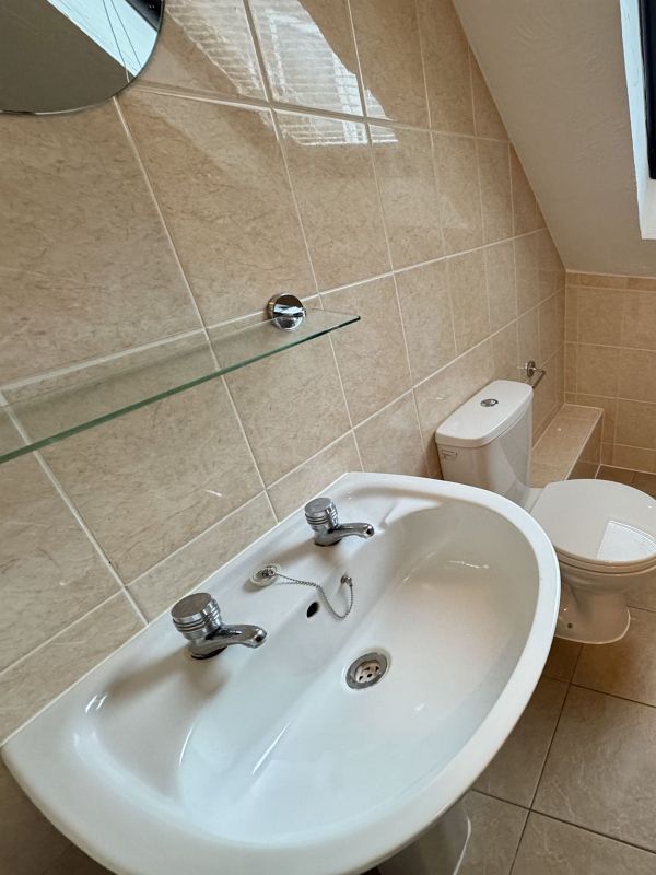 Skylight window, panelled bath with shower over, pedestal hand basin with glass shelf above, low flush WC, fully tiled walls, tiled floor, wall mounted mirror.