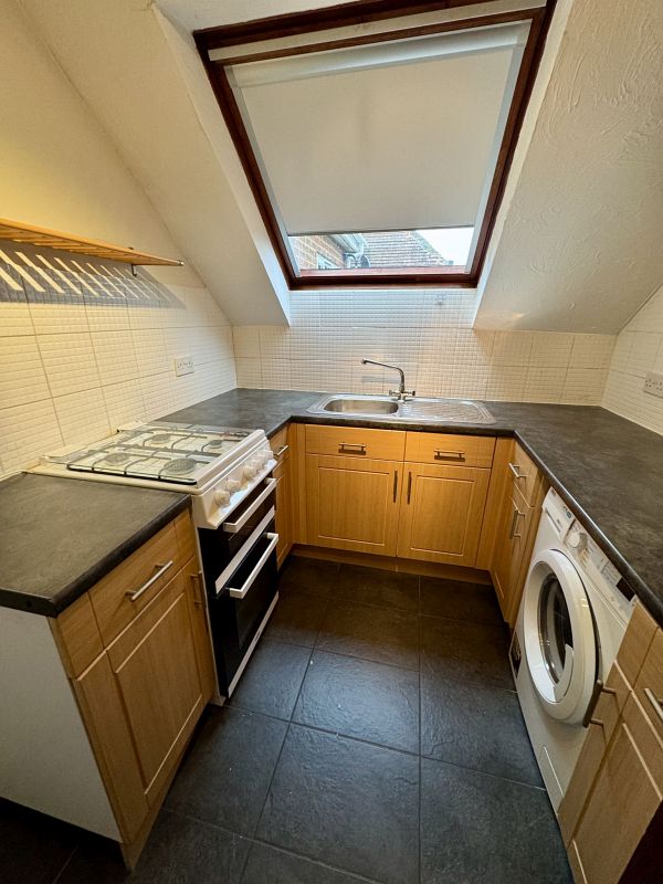 Modern fitted kitchen with stainless steel sink unit in laminate work surfaces, matching wall and base units, larder cupboard, sloping ceiling with skylight, cooker, washing machine, tiled walls, tiled floor.
