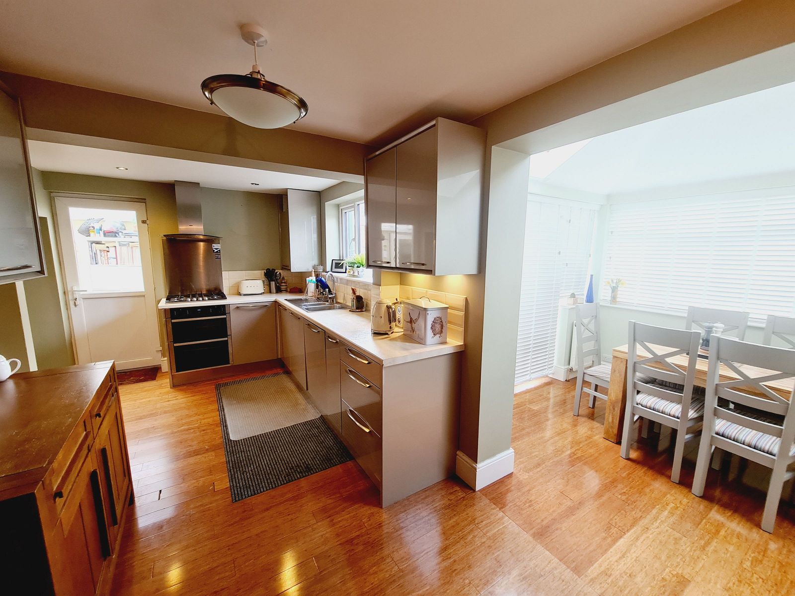 fitted with an excellent range of modern fronted gloss floor units, contrasting worksurfaces, inset one half bowl single drainer stainless steel sink unit with mixer tap, built in double oven & grill, inset 4 ring Zanussi gas hob, stainless steel splashback, Zanussi stainless stell and glass chimney style extractor, integrated dishwasher, recess for appliance, concealed Worcester combination gas fired boiler for central heating and domestic hot water, recessed ceiling lights, radiator, wood effect floor, part tiled walls, sealed unit double glazed window & door to side, dining area, radiator, wide opening to: