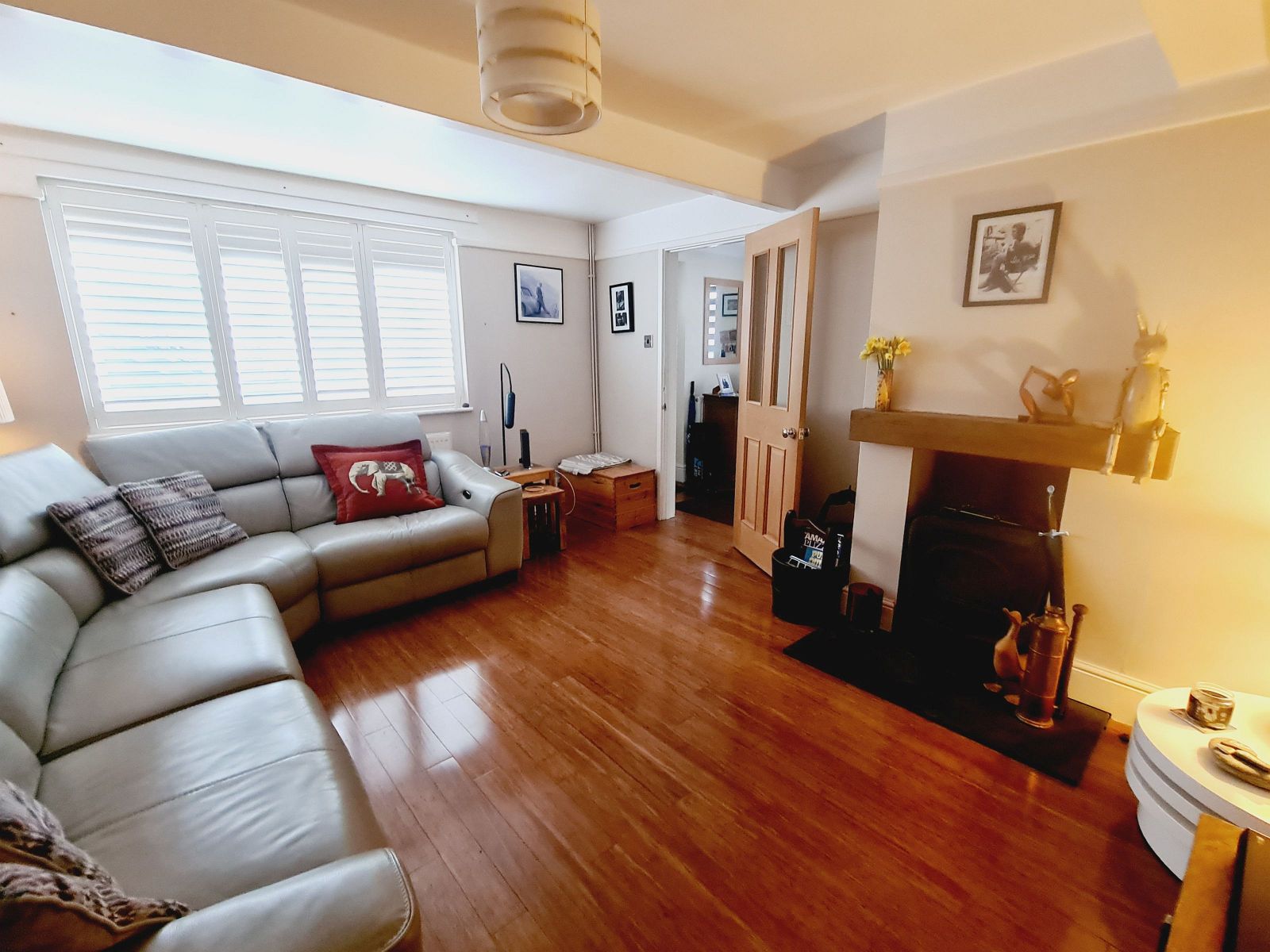 feature wood burning stove, heavy timber mantel, sealed unit double glazed window and window shutters, radiator, wood effect floor.