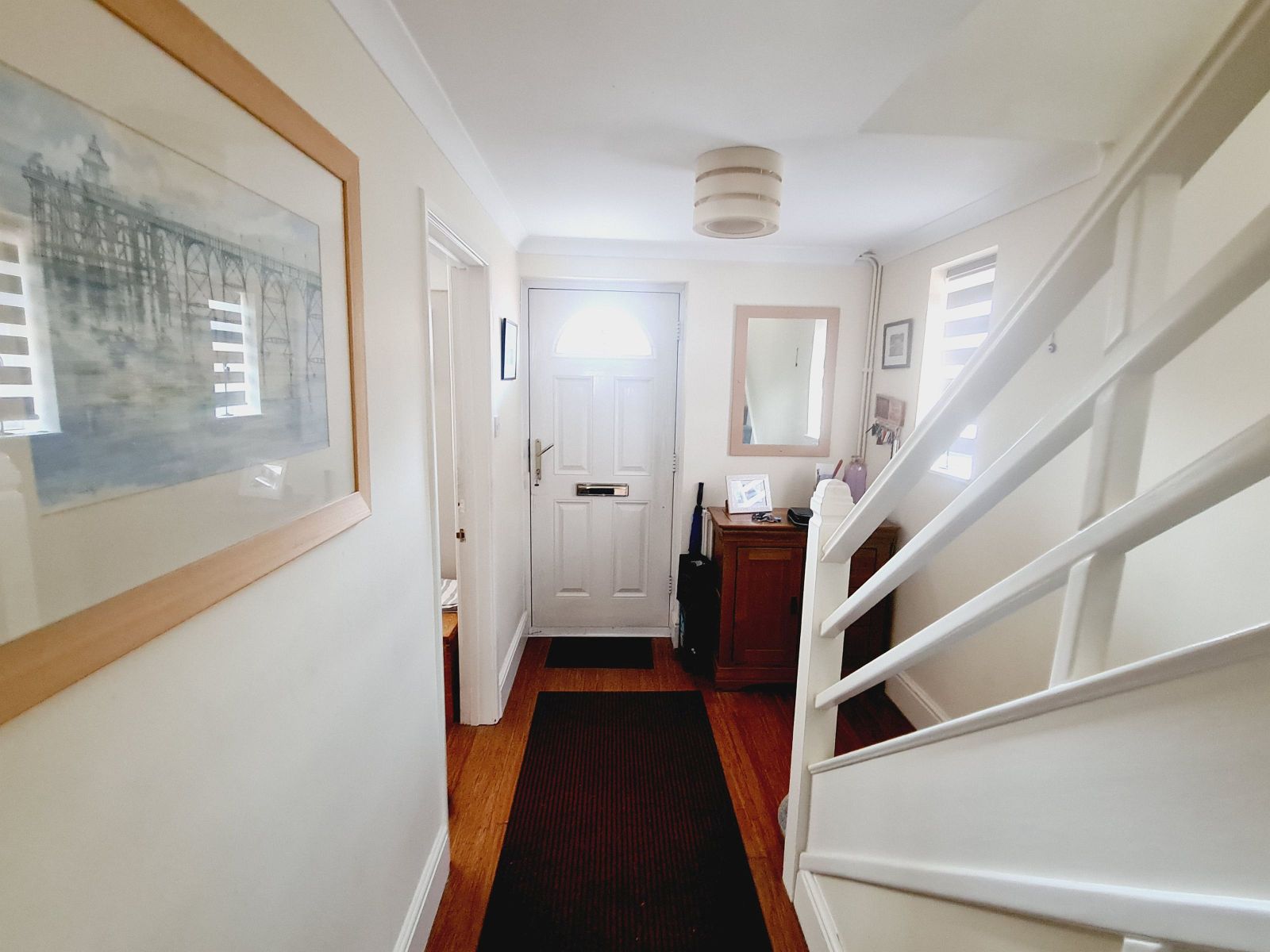 radiator, wood effect floor, under stairs storage cupboard, part glazed door to: