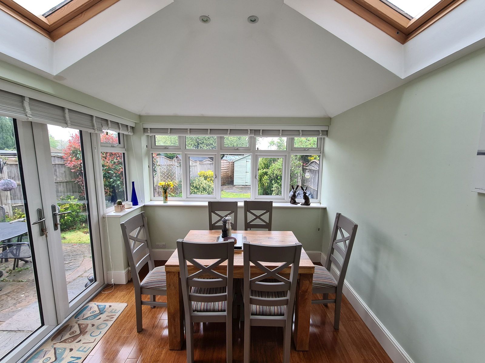 two radiators, recessed ceiling lights, two velux windows, double glazed windows overlooking the garden and french doors opening onto patio.