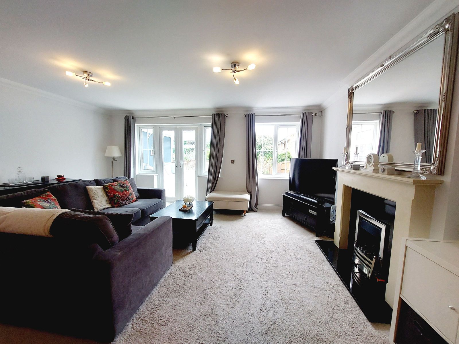 plus door entrance, attractive central stone fireplace with gas coal effect fire, recessed ceiling lights, under floor heating, built in storage cupboard, sealed unit double glazed window & double doors opening to: