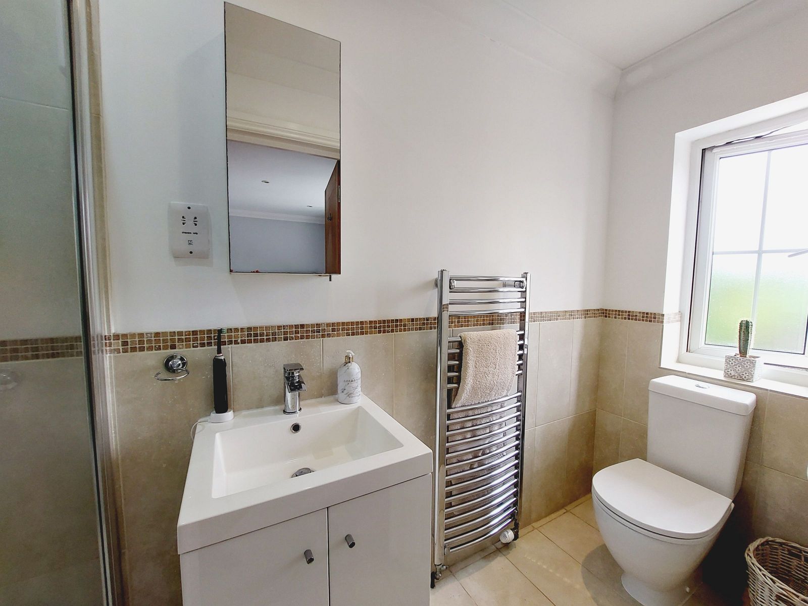 white suite comprising fully tiled shower cubicle, thermostatic shower unit, glazed sliding door, low level w.c., vanity unit, wash hand basin, mixer tap, part tiled walls, chrome heated towel rail, ceramic tiled floor, shaver point, fitted mirror, recessed ceiling lights, obscure sealed unit double glazed window.
