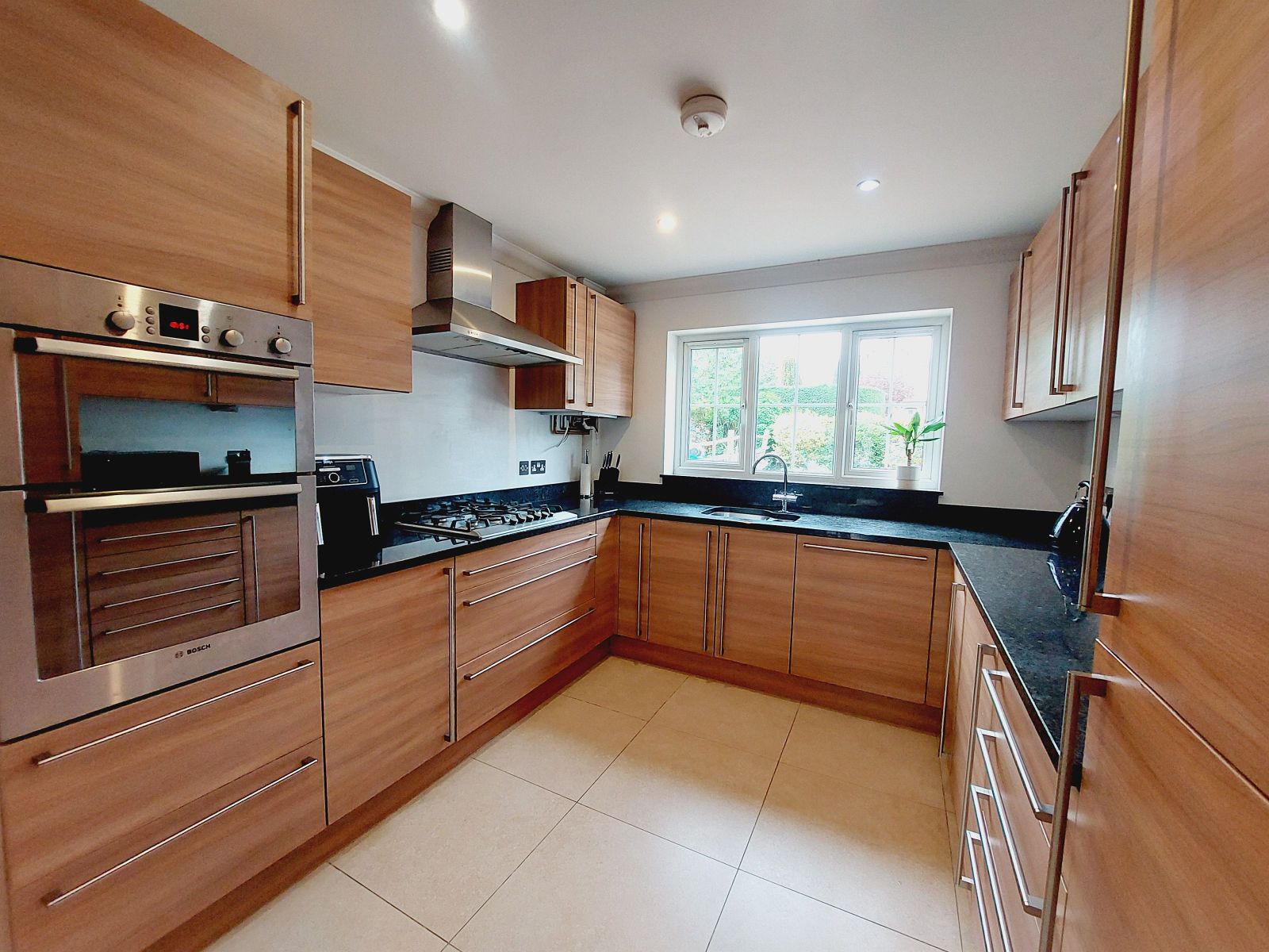 Fitted with an excellent & comprehensive range of modern wooden fronted wall and floor units with stainless steel bar handles and complimented by contrasting granite work surfaces, underslung one and half bowl stainless steel sink unit, mixer tap, built in eye level Bosch double oven/grill, inset 5 ring gas hob, stainless steel extractor fan/hood above, under counter lights, deep pan drawers, integrated fridge/freezer, integrated dishwasher & washing machine, granite upstand & window cill, recessed ceiling lights, sealed unit double glazed window, ceramic tiled floor, under flooring heating, dining area with part double glazed door to outside, ceramic tiled floor, sealed unit double glazed window, double doors opening up to:
