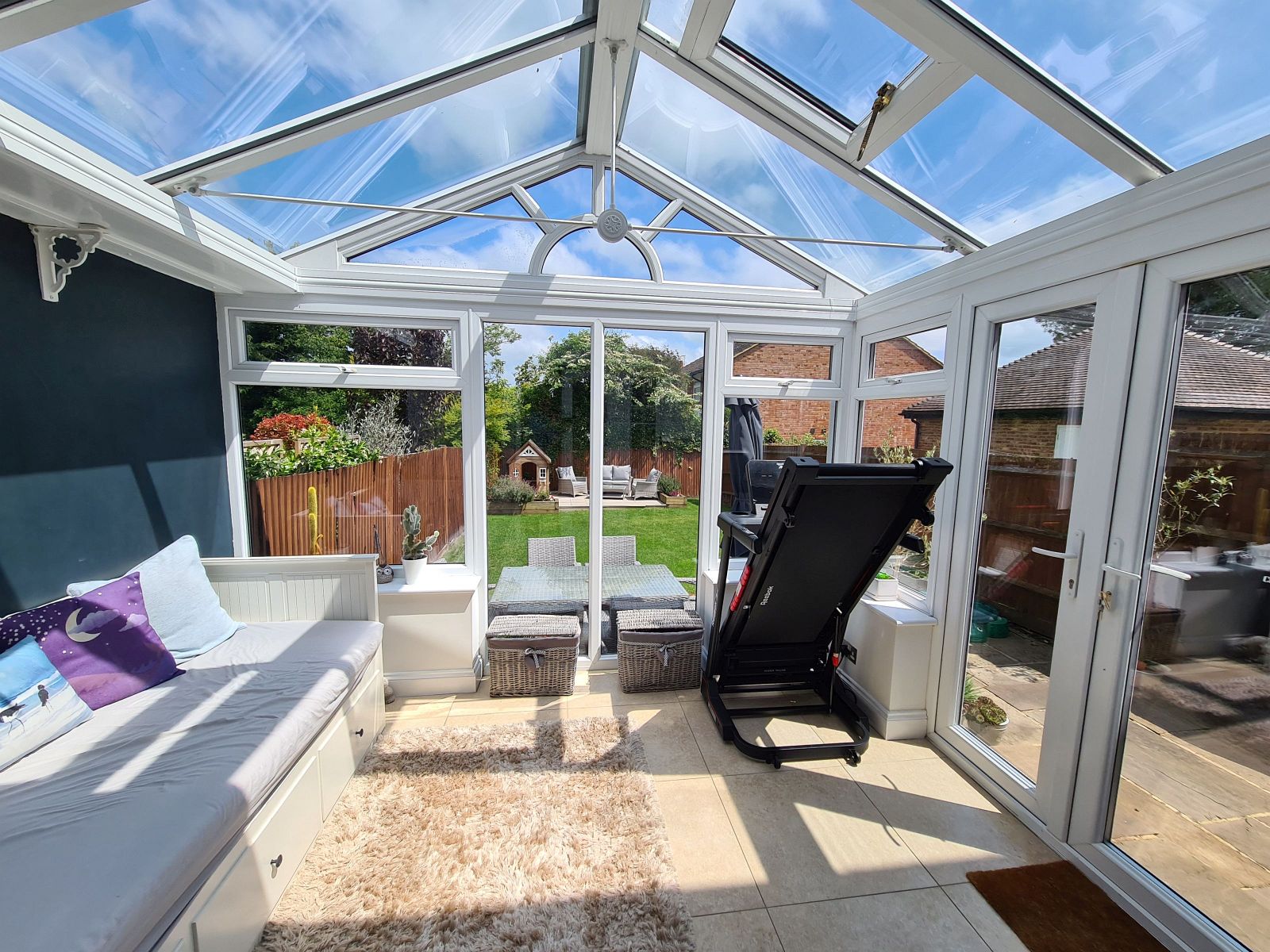 ceramic tiled floor, wall light points, under floor heating, sealed unit double glazed windows & double doors opening onto the garden.