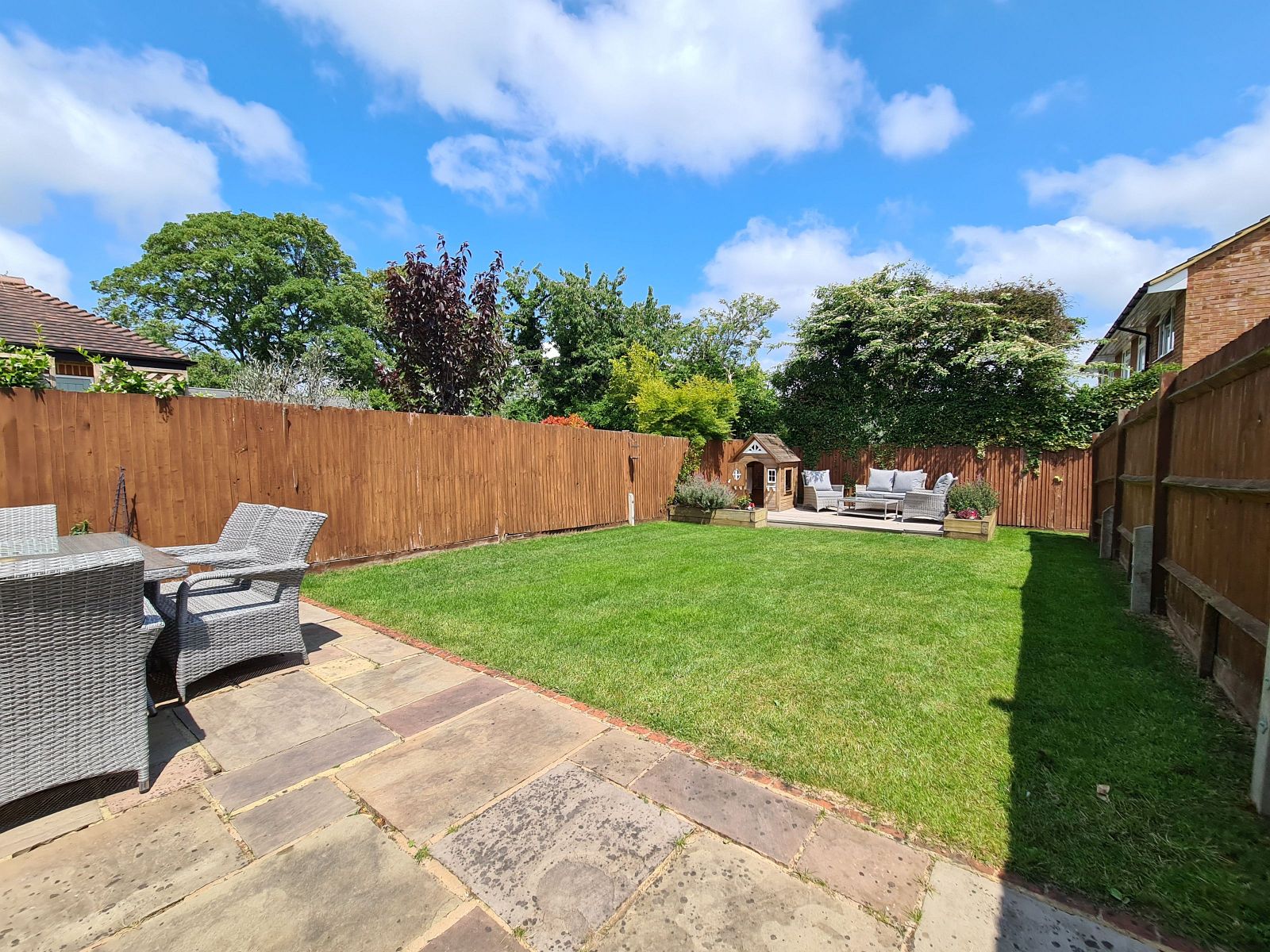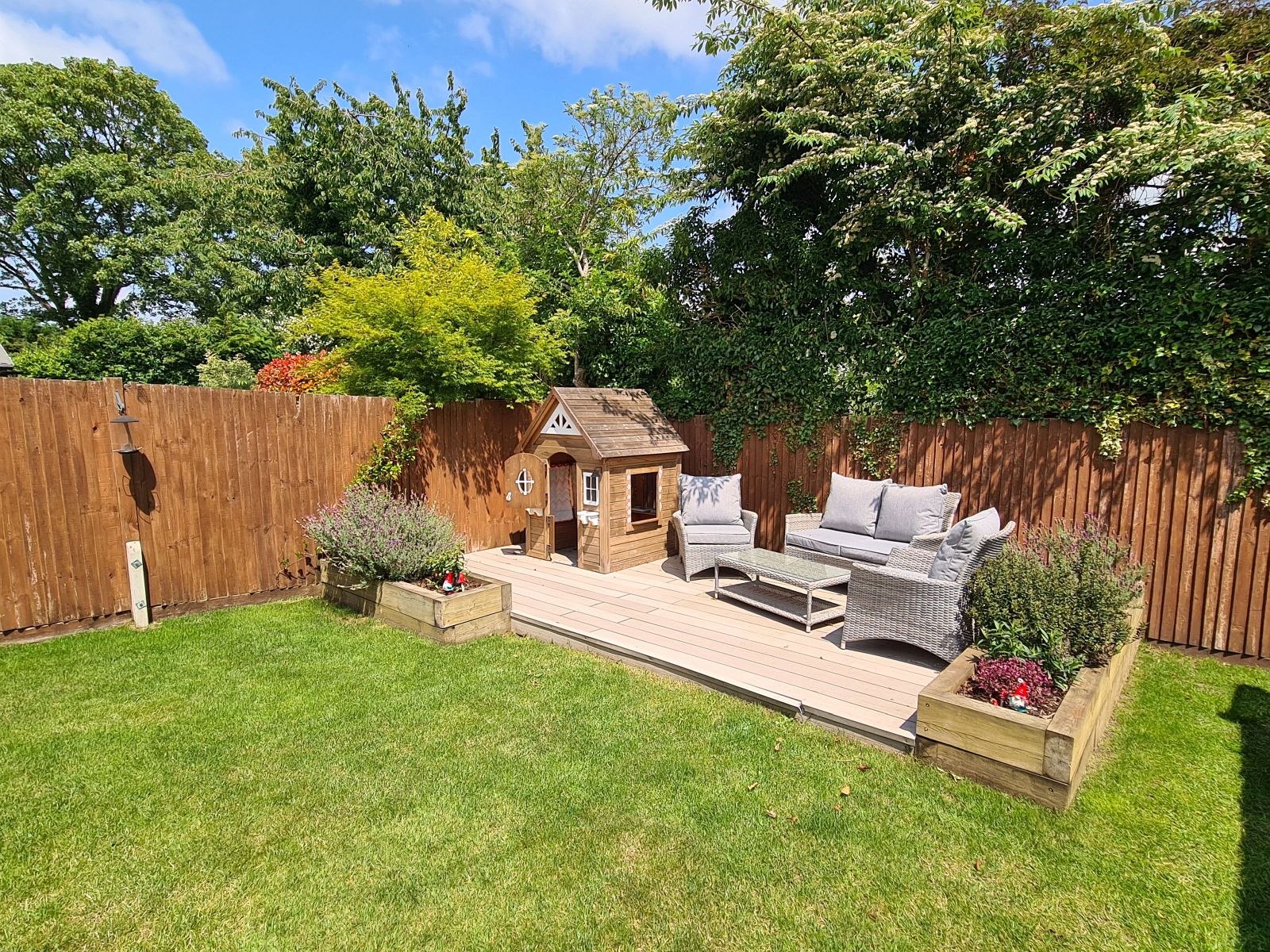 The garden is neatly laid to lawn with paved patio plus a rear decked area at the end of the garden and is enclosed by 1.8m high panel fencing. There is a wide gravel path and pedestrian gate which links the garden to an additional parking space and brick built garage.