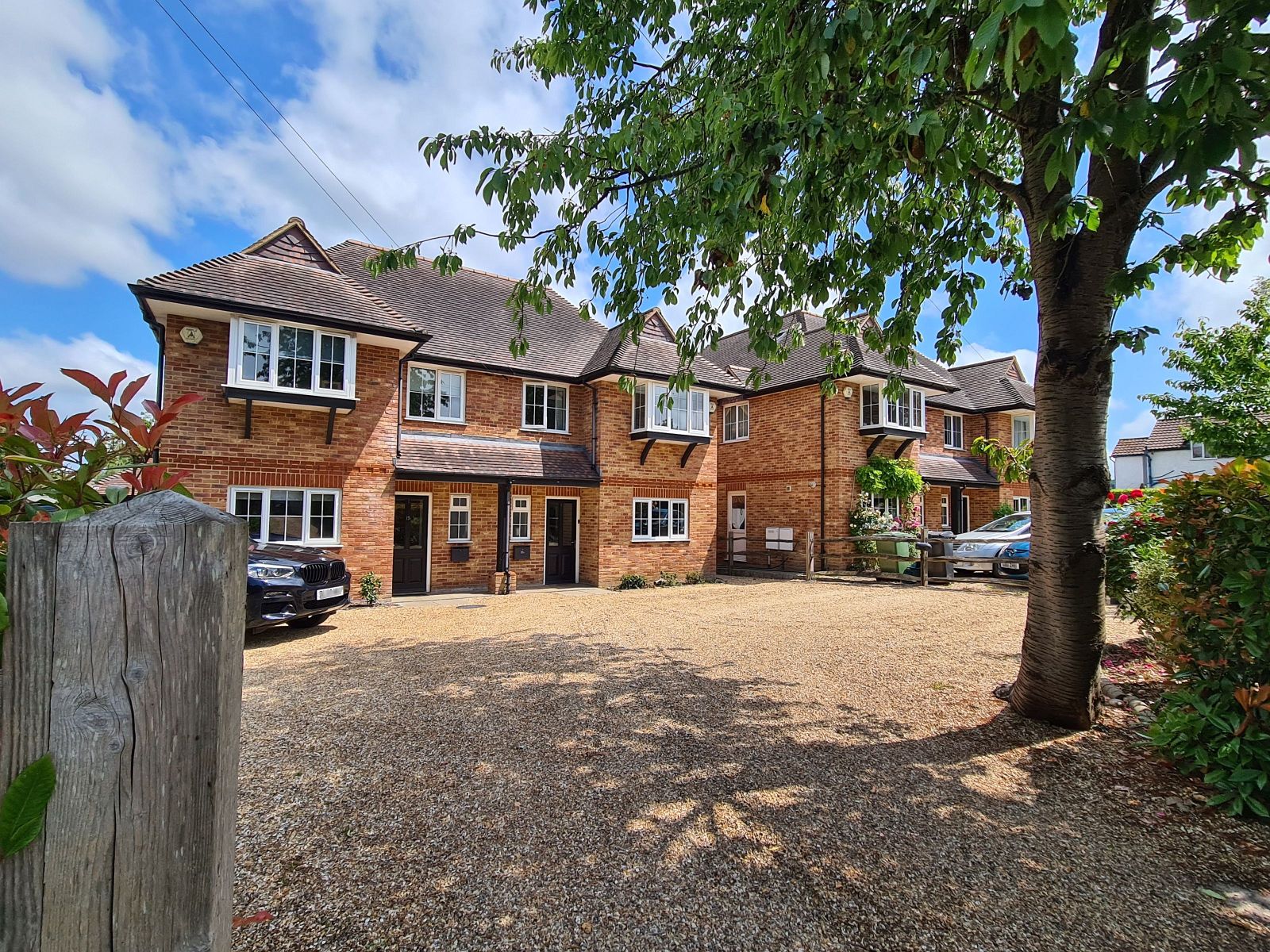 gravel driveway and turning area, parking for approximately 3 cars, partly enclosed by a post and rail fence with evergreen hedge, gas & electric meters, gate enabling pedestrian access to the rear garden.